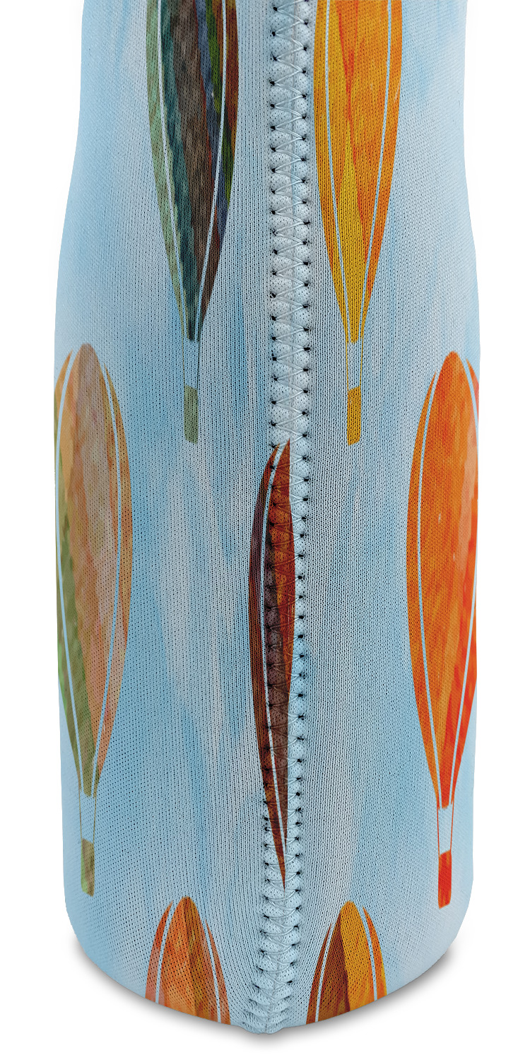 This watercolor hot air balloons design is simply adorable. The design background is the blue sky done in watercolor. The hot air balloons are also done in watercolors; in shades of oranges, reds, greens & teals.