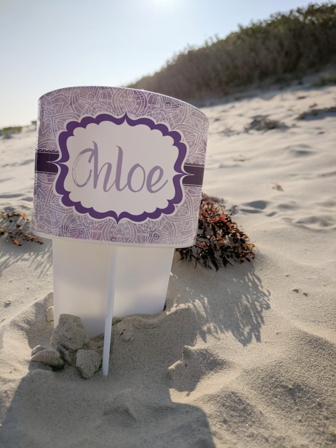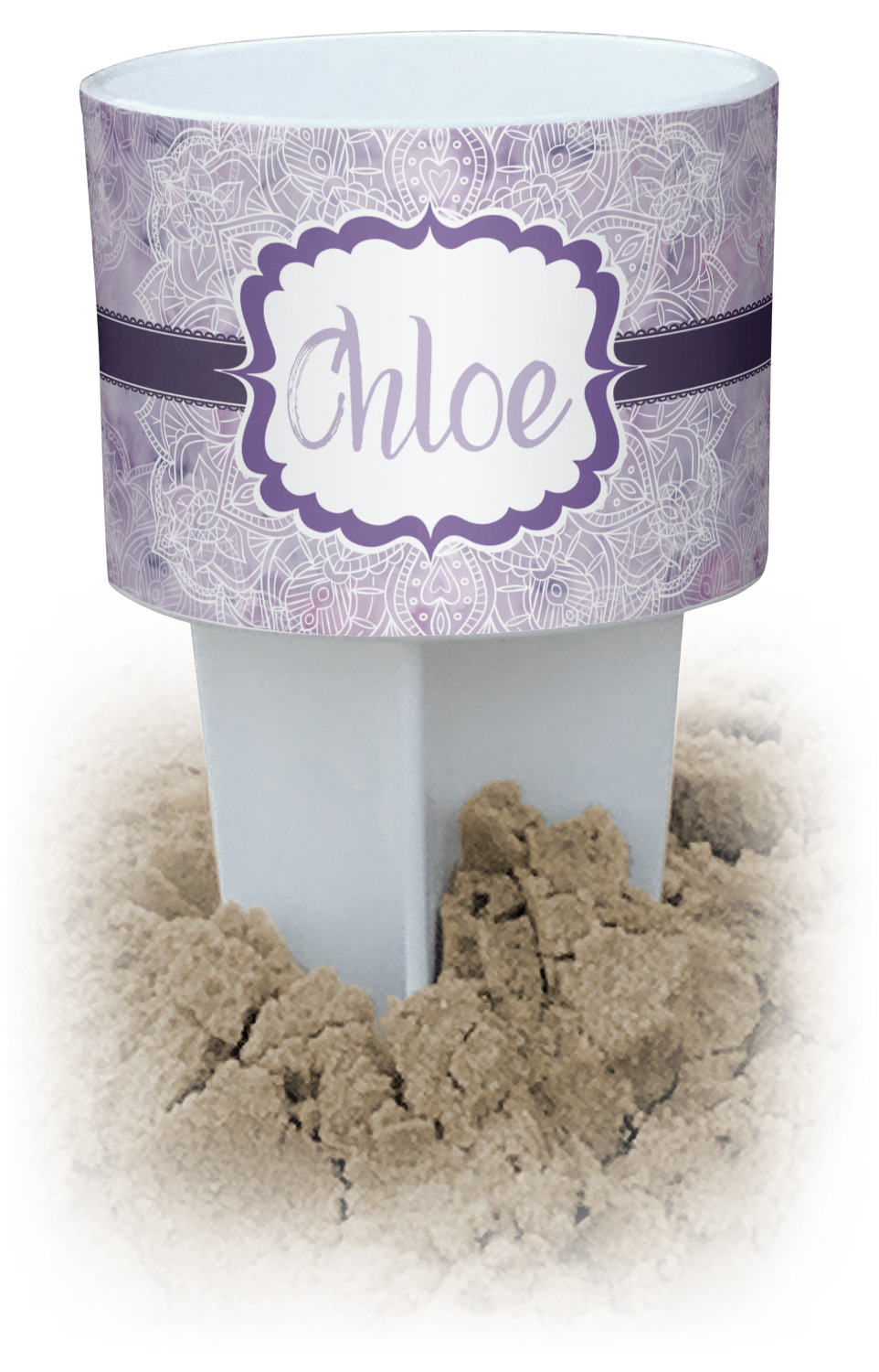 This cup holder has a large stake at its bottom that anchors it to the sand or ground below, while the cup holder rests above the stake. The entire drink holder is made of durable plastic and displays your customization around the cup holder portion. We sell these personalized beach spikers in two different colors: black and white.