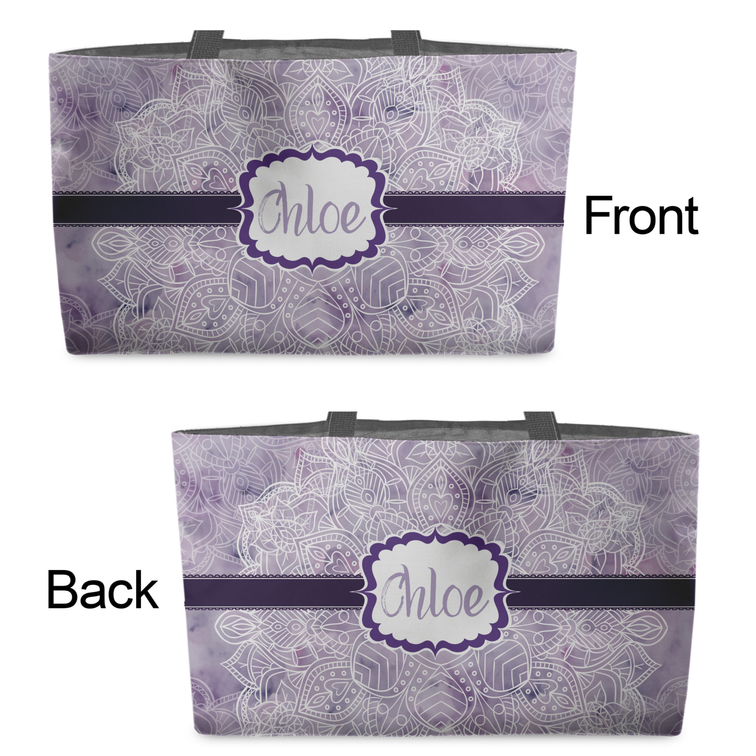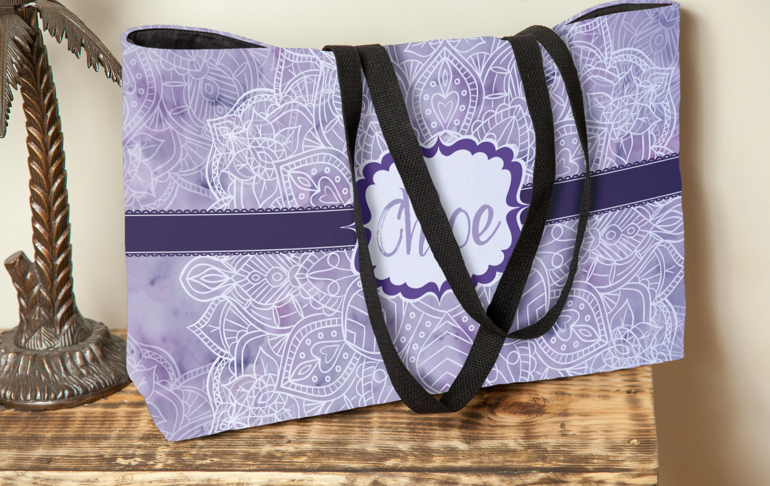 These beach totes are handmade here in the USA. Fabric is printed with your design. The tote is then sewn from the fabric pieces, lining and handles added.