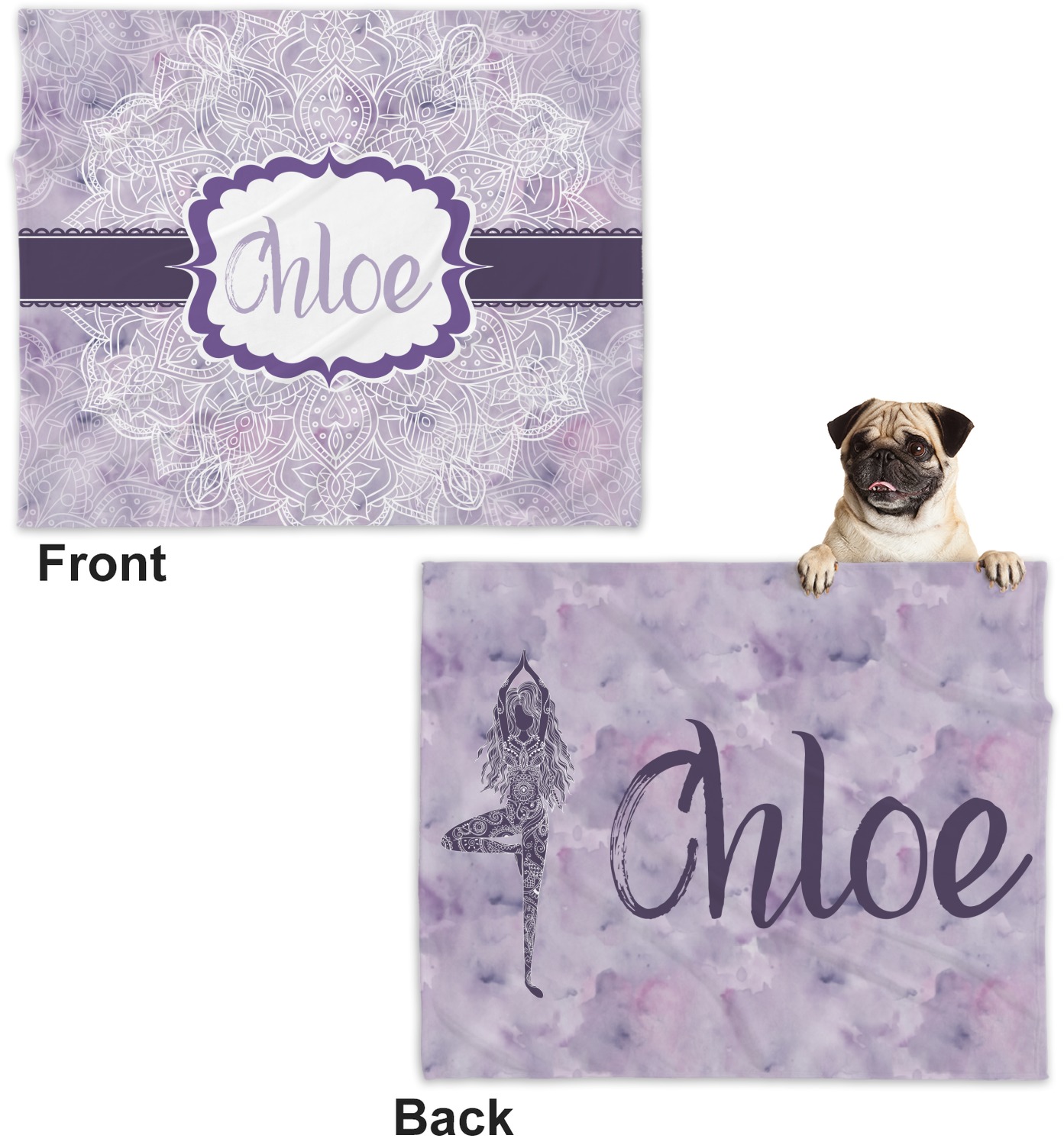 These dog blankets are crafted from a gentle, soft-to-the-touch, minky material. We print your customizations, either matching or differing, on both the top and underside of the blanket. These personalized dog blankets are available in two sizes: regular and large. Our regular size, at 40" x 30", accommodates small and some medium size dogs. At 60" x 50", our large dog blanket is a better fit for bigger breeds. Though specialized for dogs, these blankets still make a thoughtful gift for your favorite feline, or any other pet in mind!