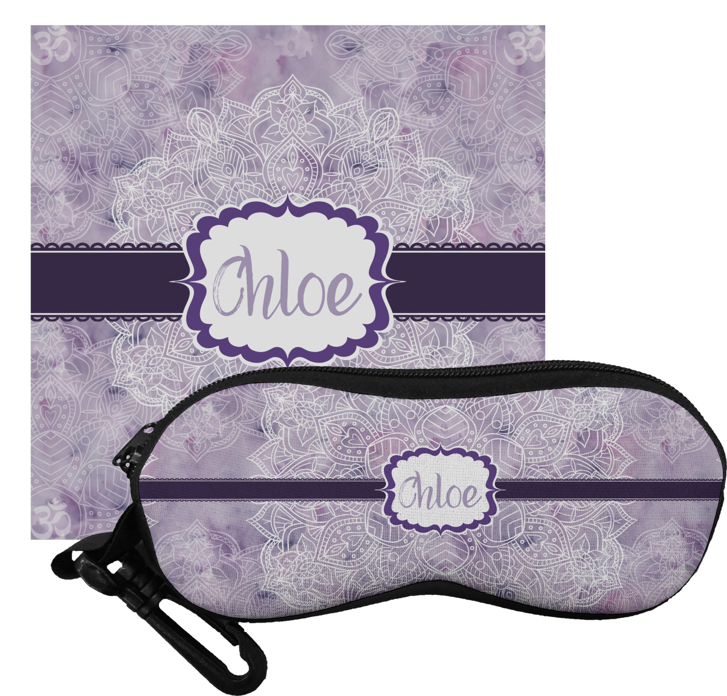 The cases have the design on both sides, a black zipper, and clips for hanging on a belt buckle or purse strap and also include matching lens cloths.