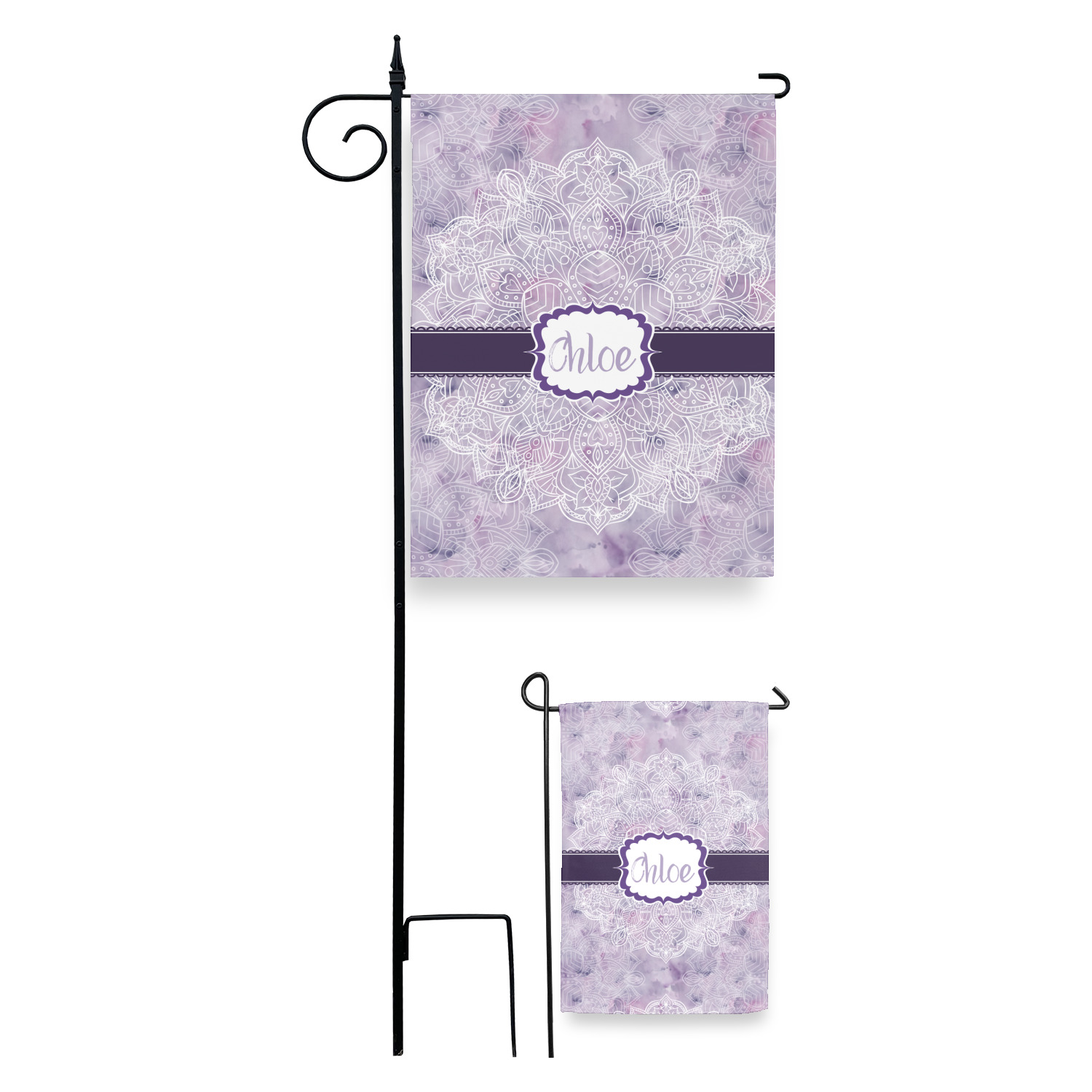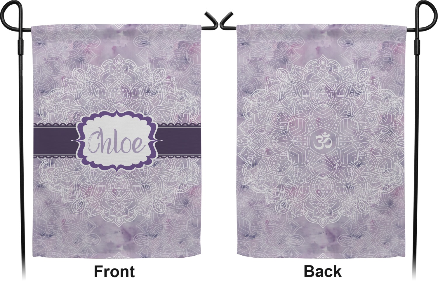 These custom garden flags are made of a durable, double-ply, polyester weave, allowing them to withstand the elements year round. The small flags measure at approximately 12 by 18 inches. The large flags measure out to 28 by 37 inches. You can order these decorative flags with your customization printed on the front only, or the front and back.