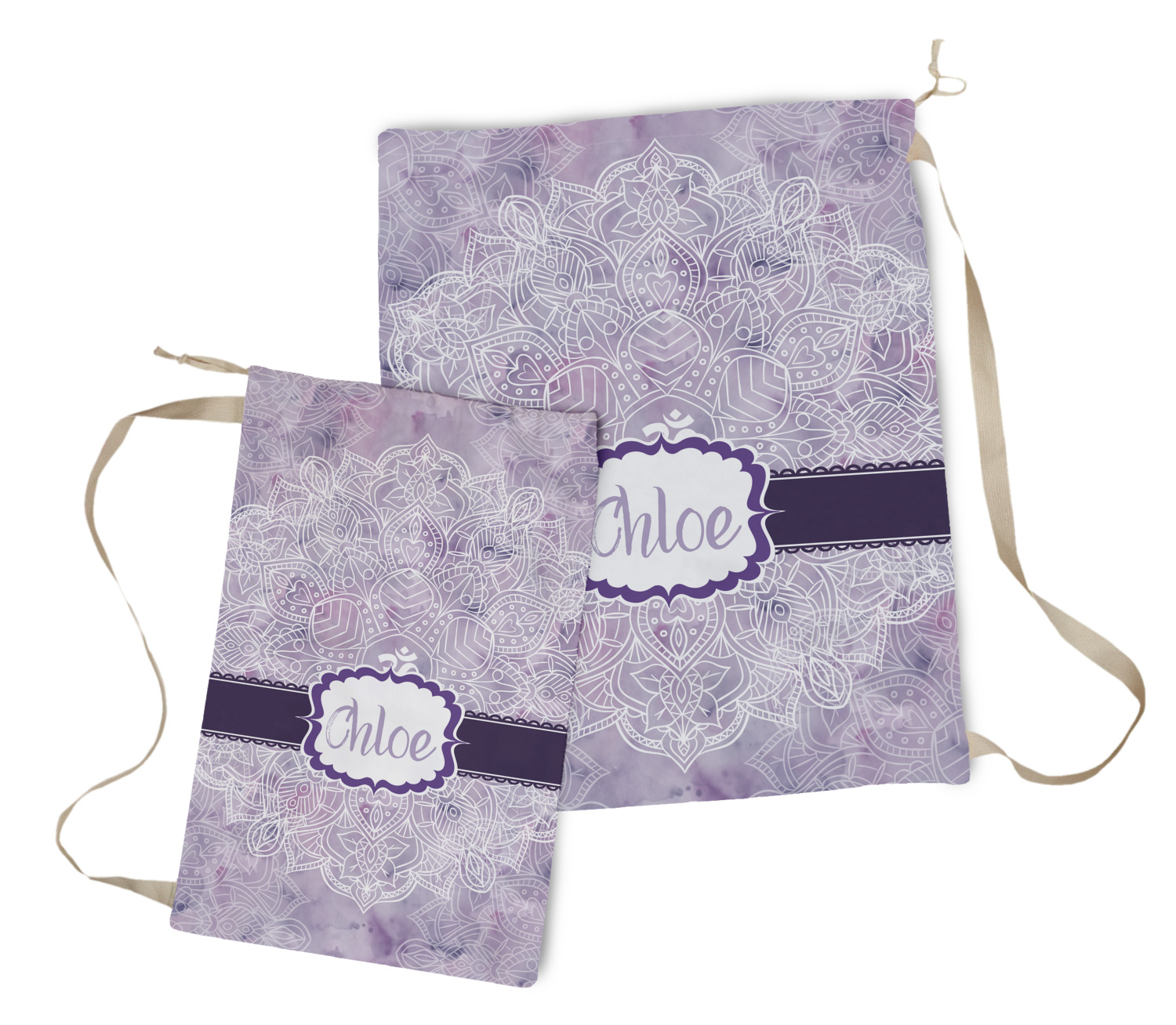Carry your laundry in style with these customized laundry bags. Available in two sizes, featuring a natural colored woven strap and a cinch cord, these bags hold a lot of clothes or anything else you want to fit in them.