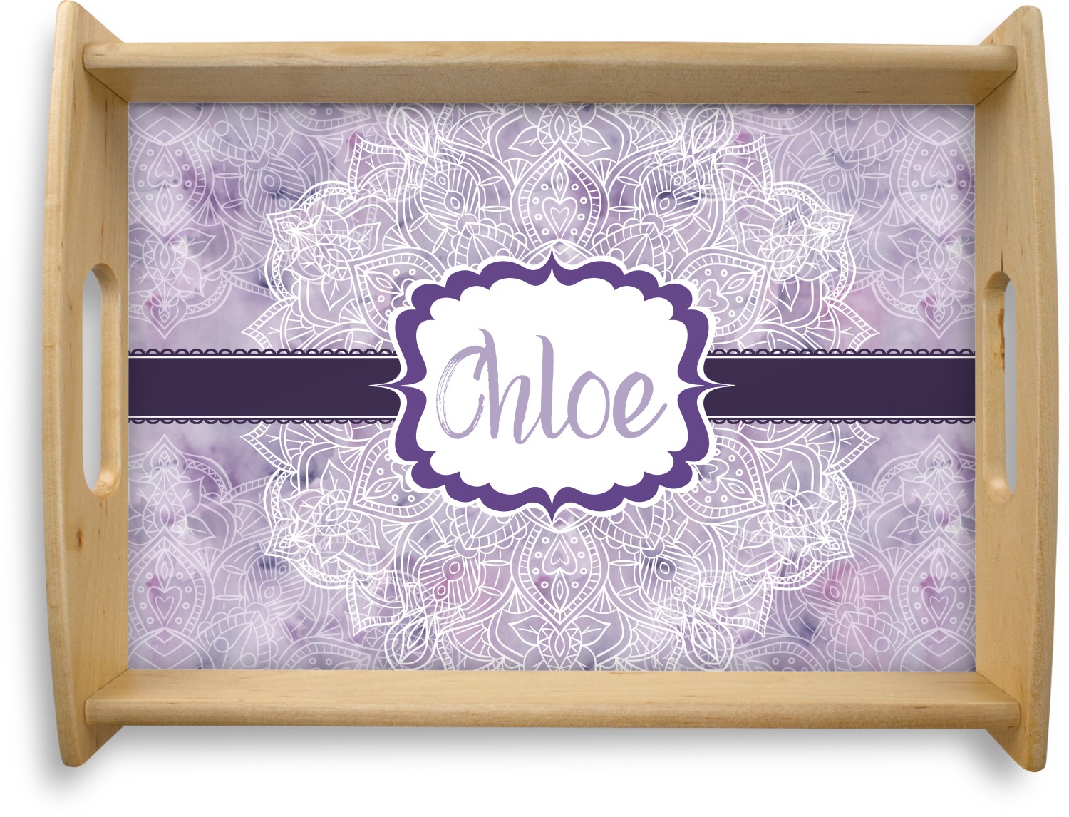 This serving tray with handles features square edges and two rounded sides, creating a very modern look. Each side is fabricated from a beautifully cut, natural wood. The bottom of the interior of the tray displays your customized design in bright, vibrant color. The tray is sold in both a black color and a natural wood look. Each variation of the wood serving tray has two sizes: Small, which is 14" x 10" x 2.25", and Large, which is 19.5" x 13.5" x 2.75".