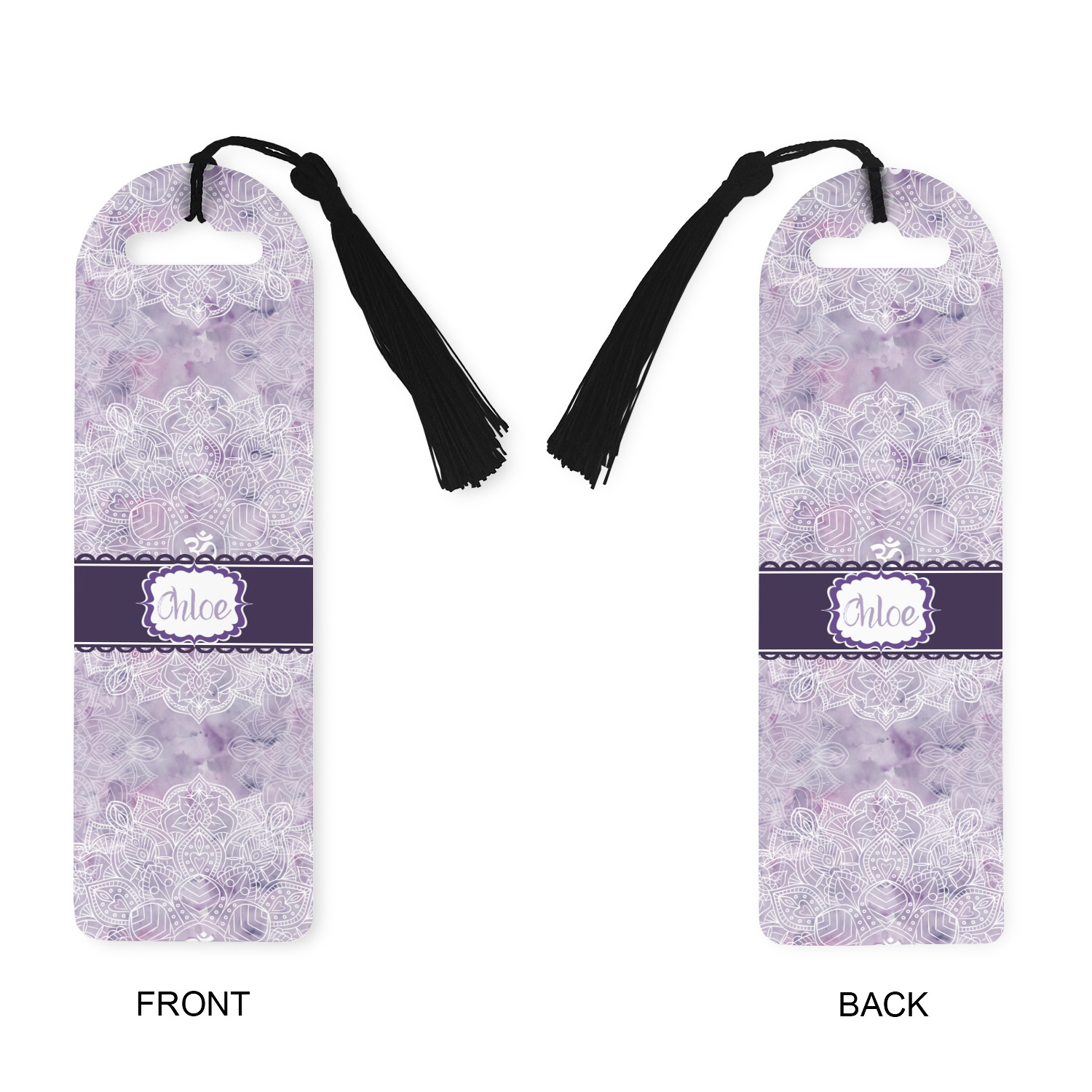 Made from a durable, flexible plastic, these bookmarks are printed with your custom design on them. With the tassel on them they make it easy to find your page in your book. These are a rectangular shape 7 1/4 inches tall with a rounded top and are approximately 2 1/4 inches wide.