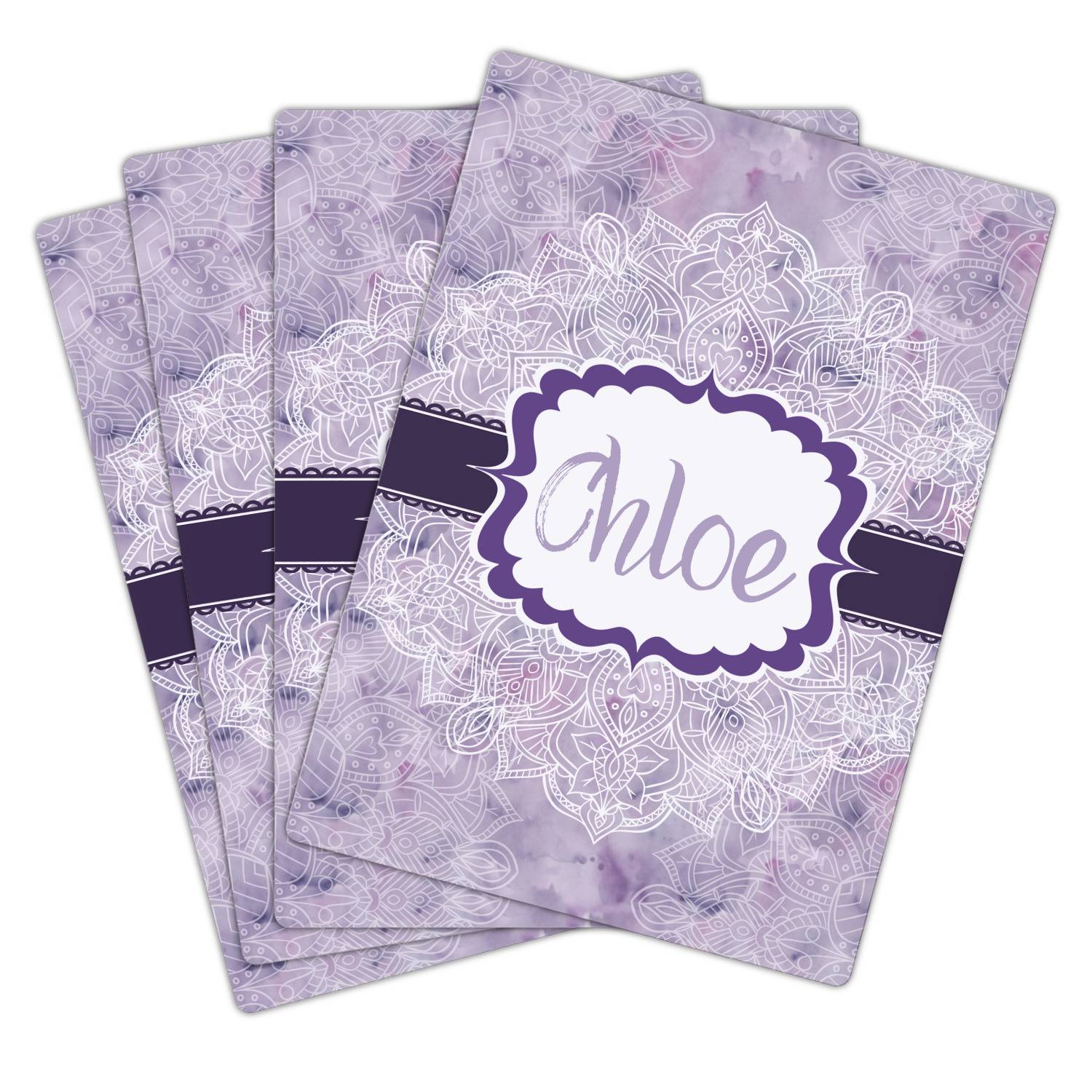 The customization / personalization is printed on the back side. The playing cards have a low gloss coating on both sides. The cards are packaged in a clear plastic box.