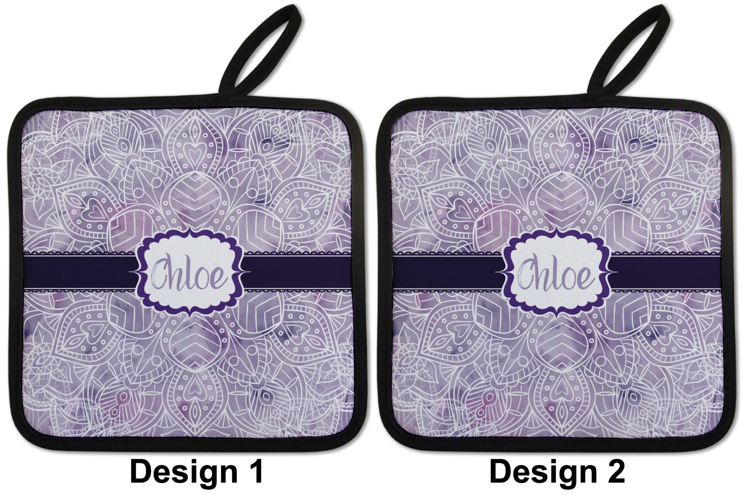 Our personalized pot holders feature a neoprene front that displays your personalization in vibrant colors. The backing of the hot pot holder is rubberized; the textured backing allows you to have a great grip when using this custom pot holder. The two materials are joined with a sleek, black trim, and the holder also includes an attached loop for hanging and storage. The pot holder is approximately 8.75 inches by 8.75 inches and 0.25 inches tall, while the fabric loop is 2.5 inches long. You can purchase a kitchen pot holder by itself or as a set of 2. We also offer a set including one pot holder and one oven mitt.