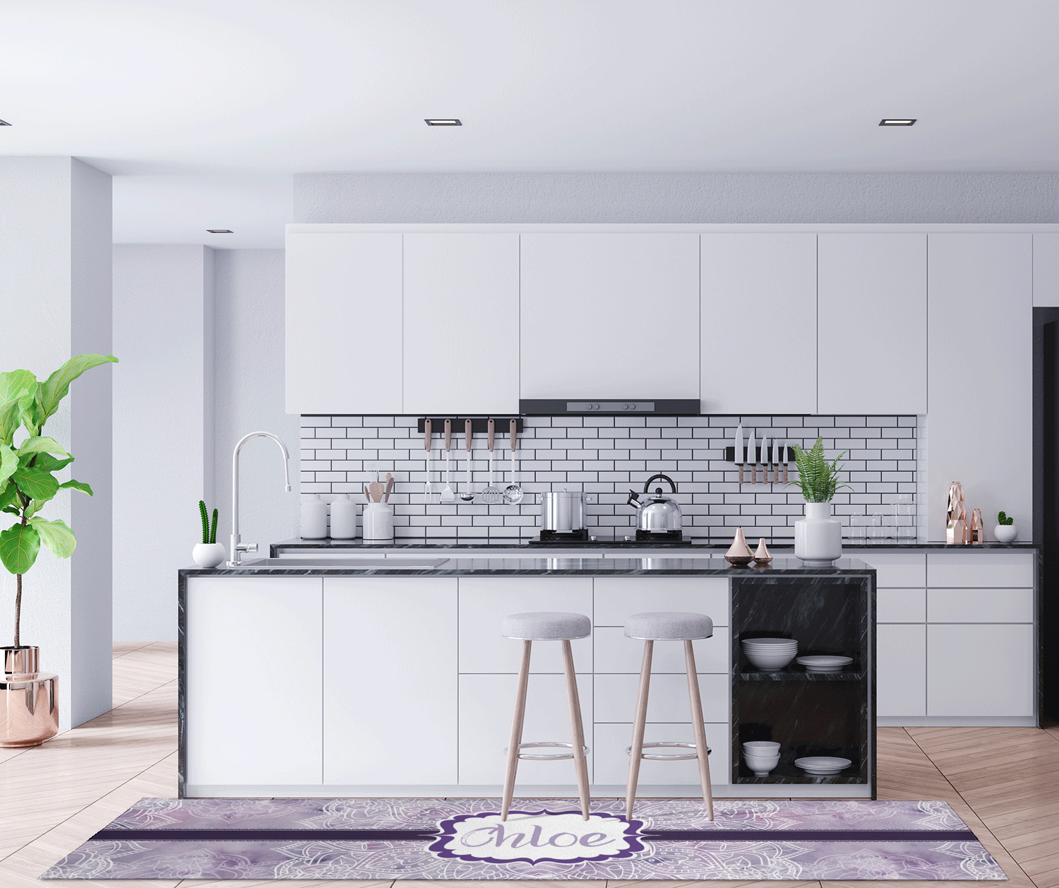 If you want to design it for your hallway - a vertical design is the perfect fit. If designing for to go in front of your kitchen island a horizontal design would suit you best! In our design system you can rotate the design either way to get the product you want.