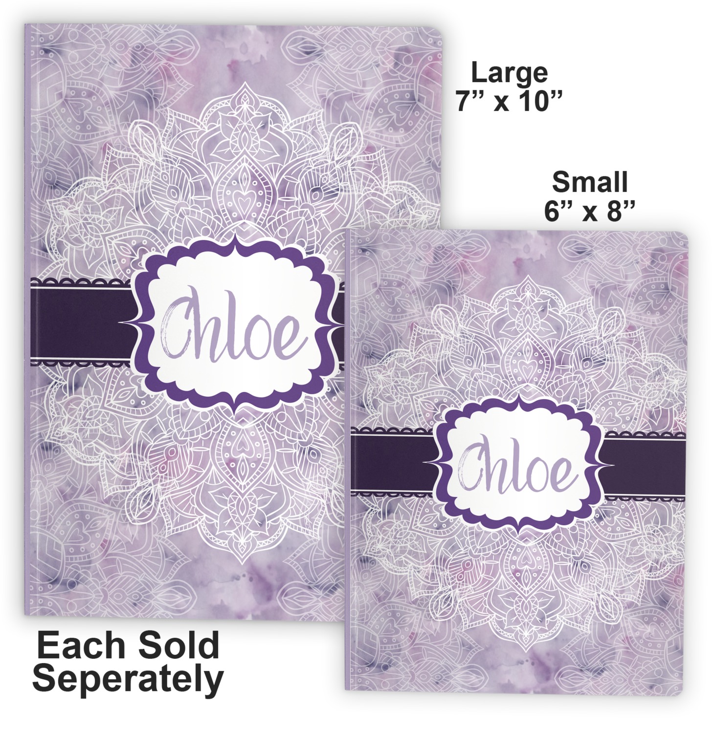 We offer these notebooks in two different sizes. The small notebook is 8" x 5.75", and fits snugly in purses or totes. The large notebook measures at 10" x 7.25", and can be carried in briefcases and backpacks.