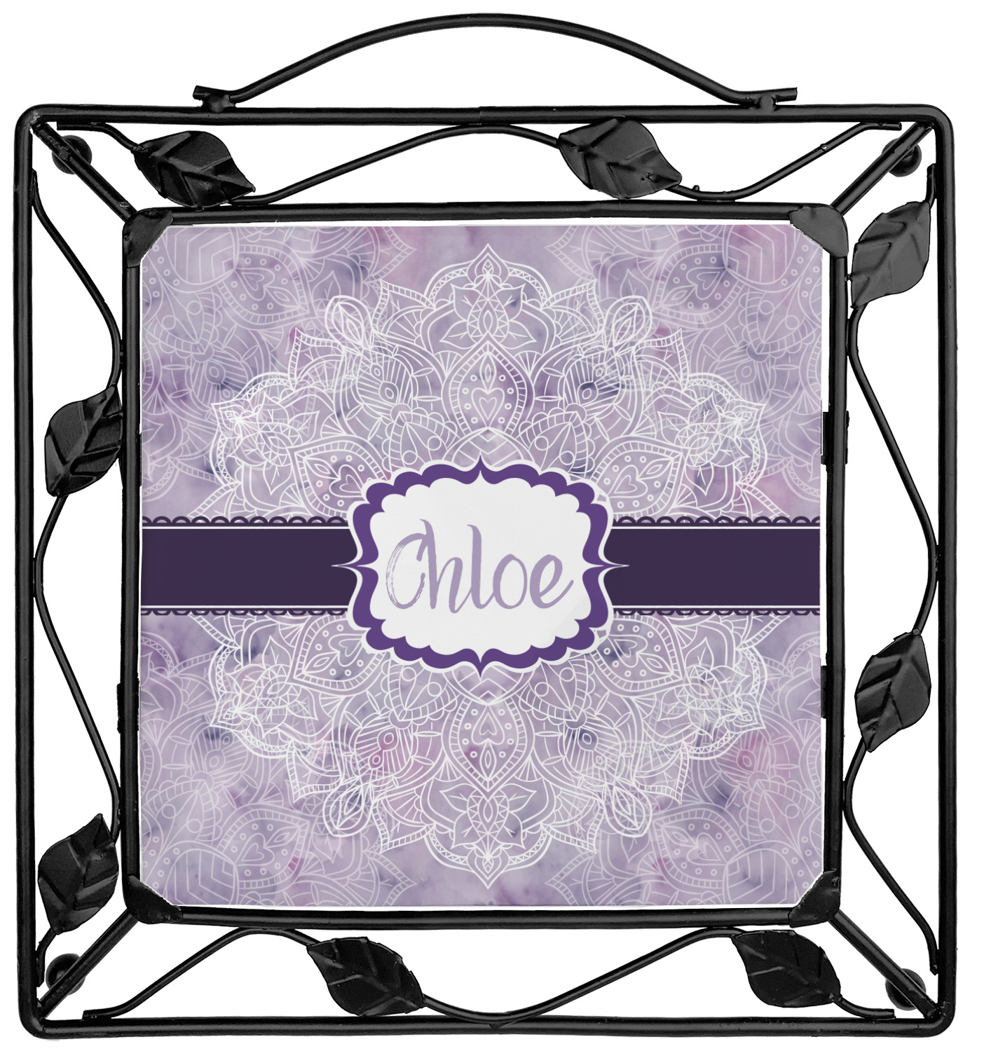 Our square trivets are made from a durable, wrought iron. This model features 4 small half circles, one on each corner, and a larger ring of iron that circles the central, customized tile. Each of the 4 corners has a round foot on its bottom for stability. This trivet is 8.75 by 8.75 inches, but the central tile measures at 6 inches on both sides.