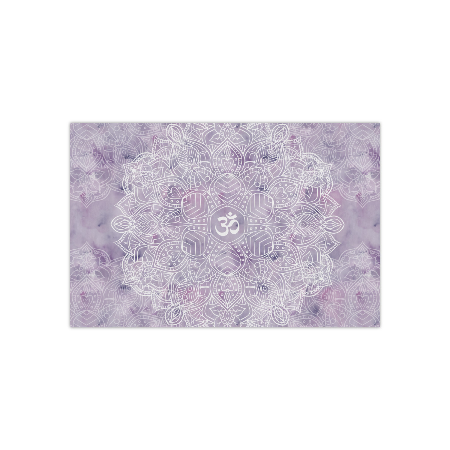 The background contains an elegant mandala with the om symbol sitting peacefully in the middle. The watercolor background behind the mandala gives the design a cool feeling. The graphic chosen repeats a similar pattern to the mandala on the figure doing yoga for the graphic and wide format. The Om symbol is used as the last graphic element.