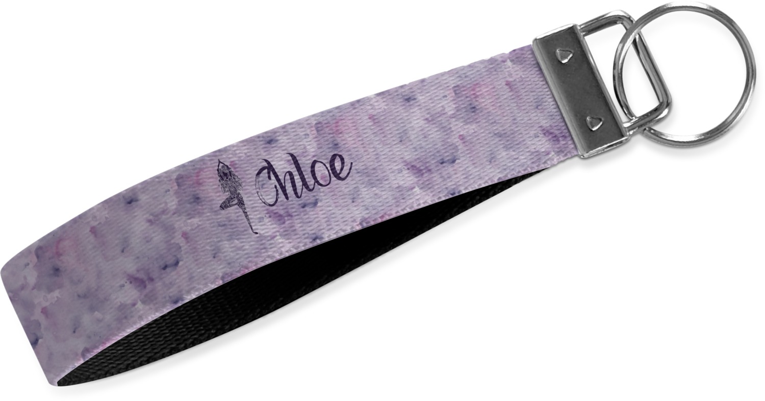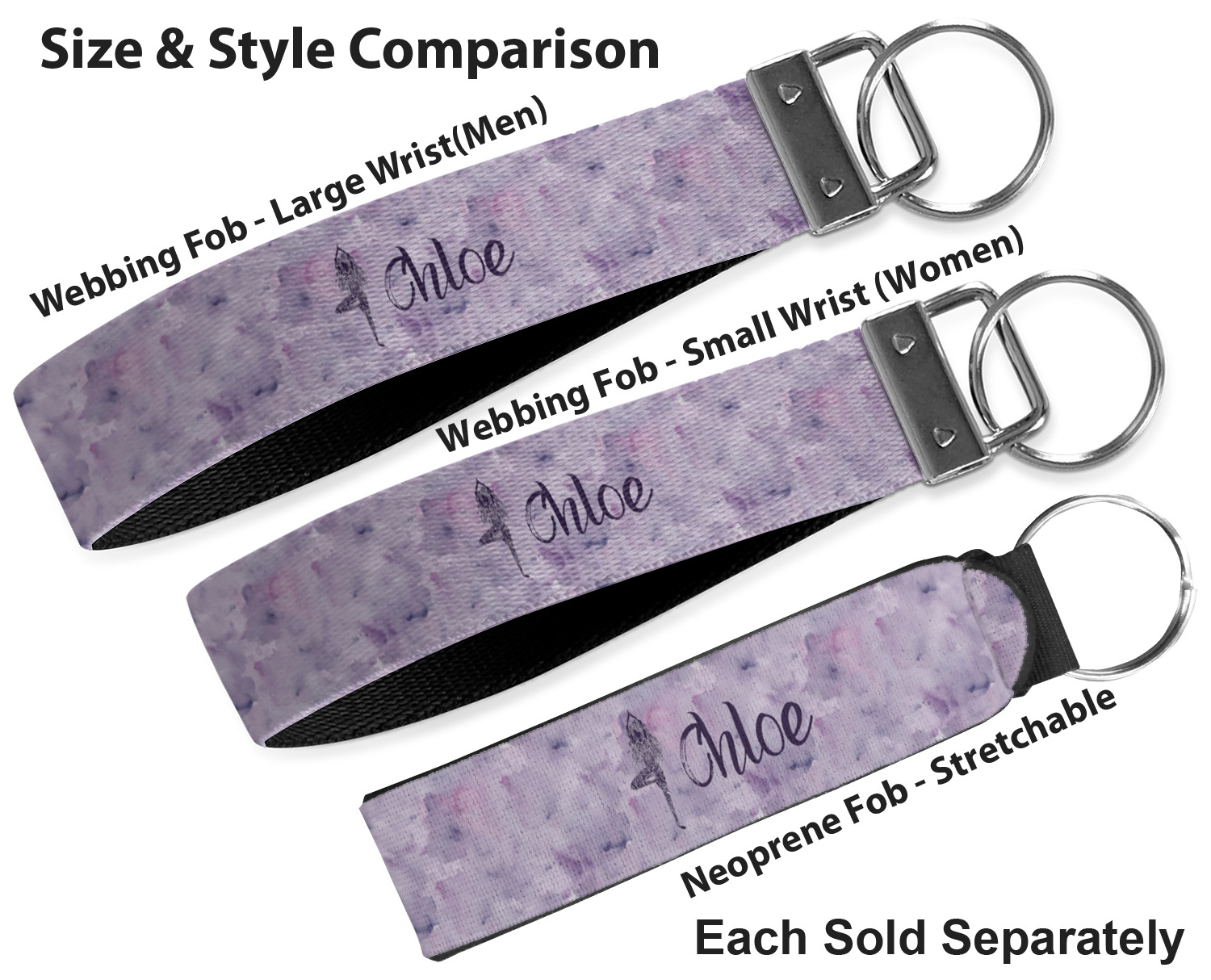 These key fob keychains are made from a polyester weave, right here in the USA. They feature a silver, metal clasp, attached to a round keyring. The piece gives the personalized wristlet a beautiful, finished look. Your customized design is printed on the outside of the keychain strap. We carry these wristlets in two sizes: small, which is 5 inches in width, and large, which is 5.5 inches in width.