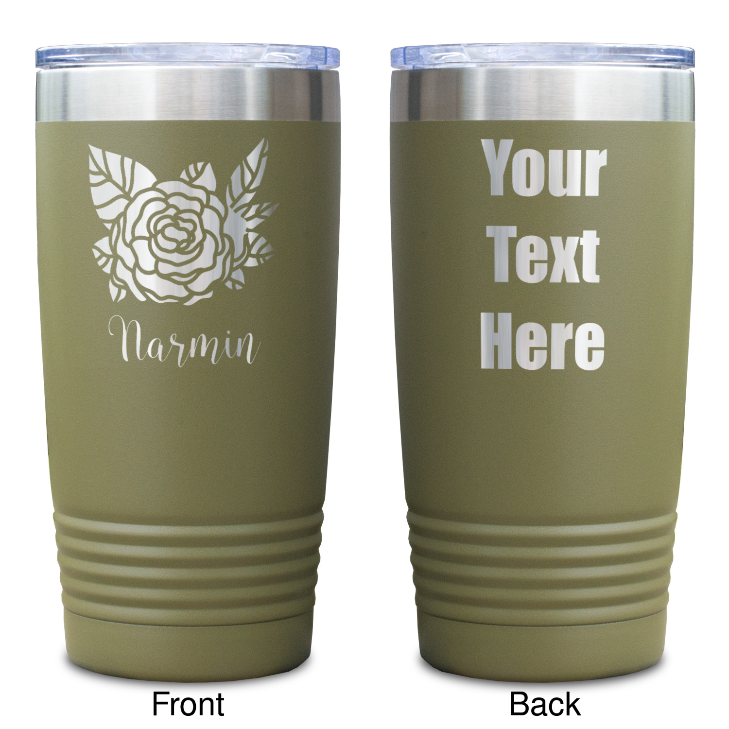 Available in 8 unique colors, these cups are crafted from 18/8 stainless steel and powder coated for their durable finish. With the 8 colors being Black, Pink, Red, Teal, White, Grey, Royal Blue, and Olive Green, you are sure to find a cup to fit your personality. You can chose to engrave on the front or the front and back of the cup. Use our design studio to design your own cup and we laser engrave it for you.