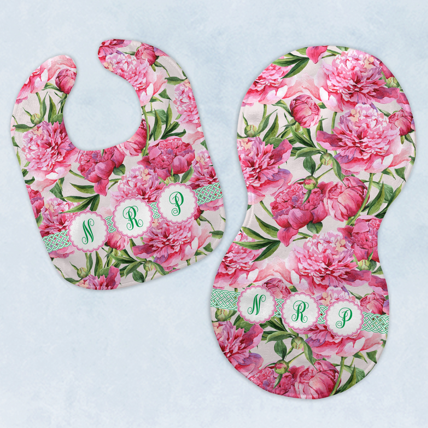 Both our baby bib and burp pad are made up of soft, microfiber velour with a cotton backing. The comfortable and plush material of our bib and burp set is perfect for both baby and parent. We print your design on the microfiber velour face fabric with baby safe ink on your customizable bib and burp cloth to ensure safety for the little one! Our drool bib also comes with a Velcro clasp for safe and easy wear while the burp cloth is a unique peanut shape that perfectly hugs over the shoulder.