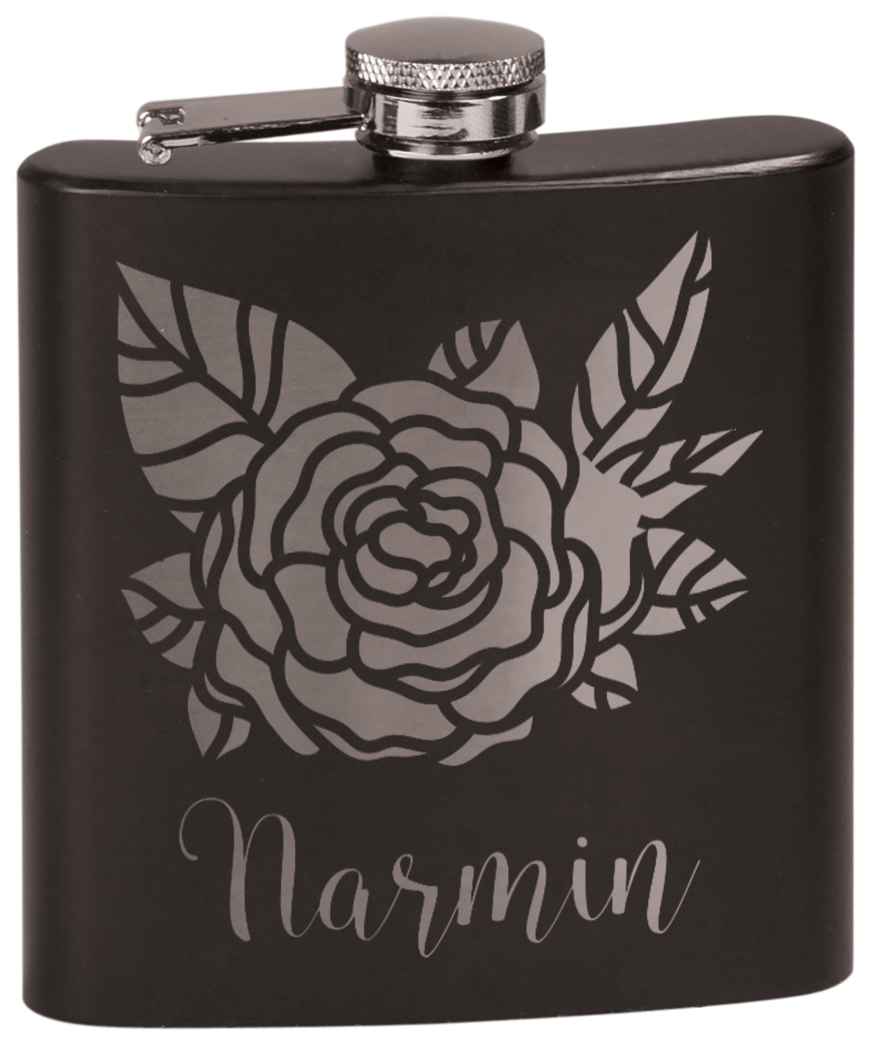 Built from a stainless steel and then covered with a black coating, this hip flask, has a very classy appearance. Similar to the standard flask, this stainless steel flask has the traditional curved shape for a snug fit in your palm. This flask set also includes a traditional screw and flip lid and liquid funnel in a gift box. At 4 by 4.5 inches, this flask can hold up to 6 ounces. Your personalized design is laser-engraved across the front of this flask.