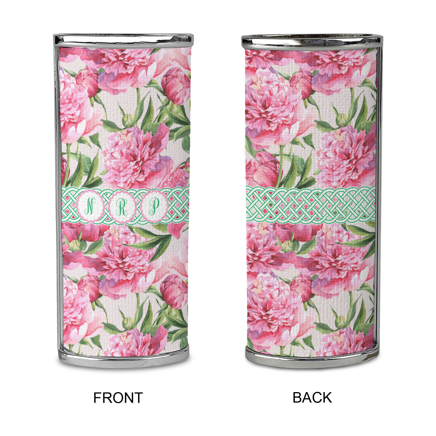 We chose to personalize it with Celtic ribbon and triple scallop labels with initials in each one of the labels. The coordinating design is also stunning with stripes of pink on the bottom.