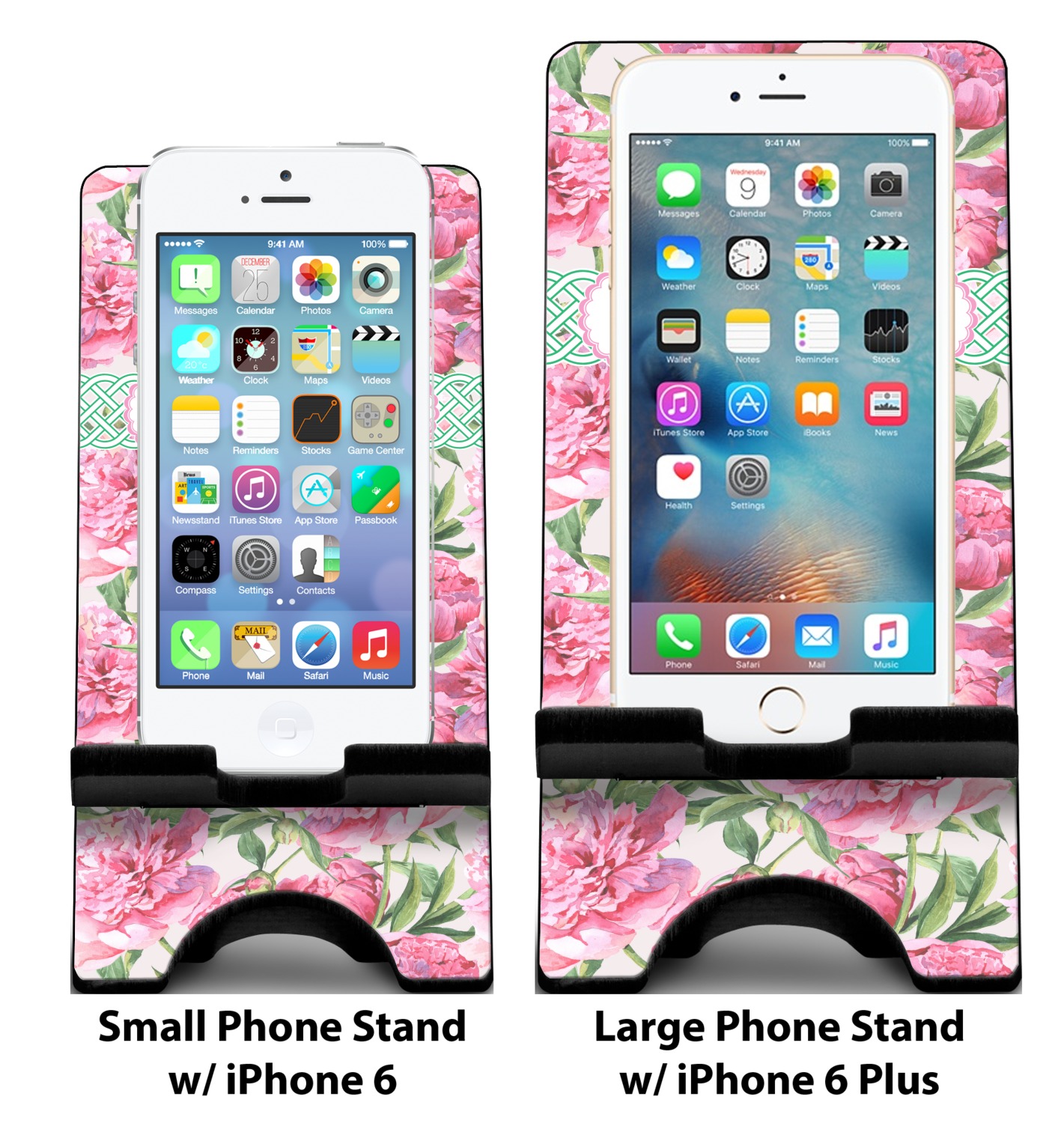 To meet your needs, we offer four variations of this IPhone stand. The backboard of the first version is shaped as a plain, yet sleek rectangle, and is available in two sizes. Our smaller size is approximately 4 by 3.25 by 7 inches, while the larger model is 4 by 3.77 by 8.5 inches. Alongside this model, we also provide you with a more decorative option. The upper part of our second version features a curved edge, for a classy, suave appearance. This phone holder is also sold in two sizes: a smaller version, which is 4 by 3.25 by 7 inches, and our larger model, which is 4 by 3.77 by 8.5 inches. Both models will support large phones, but the larger model is better if you wish to proudly display your personalized design.