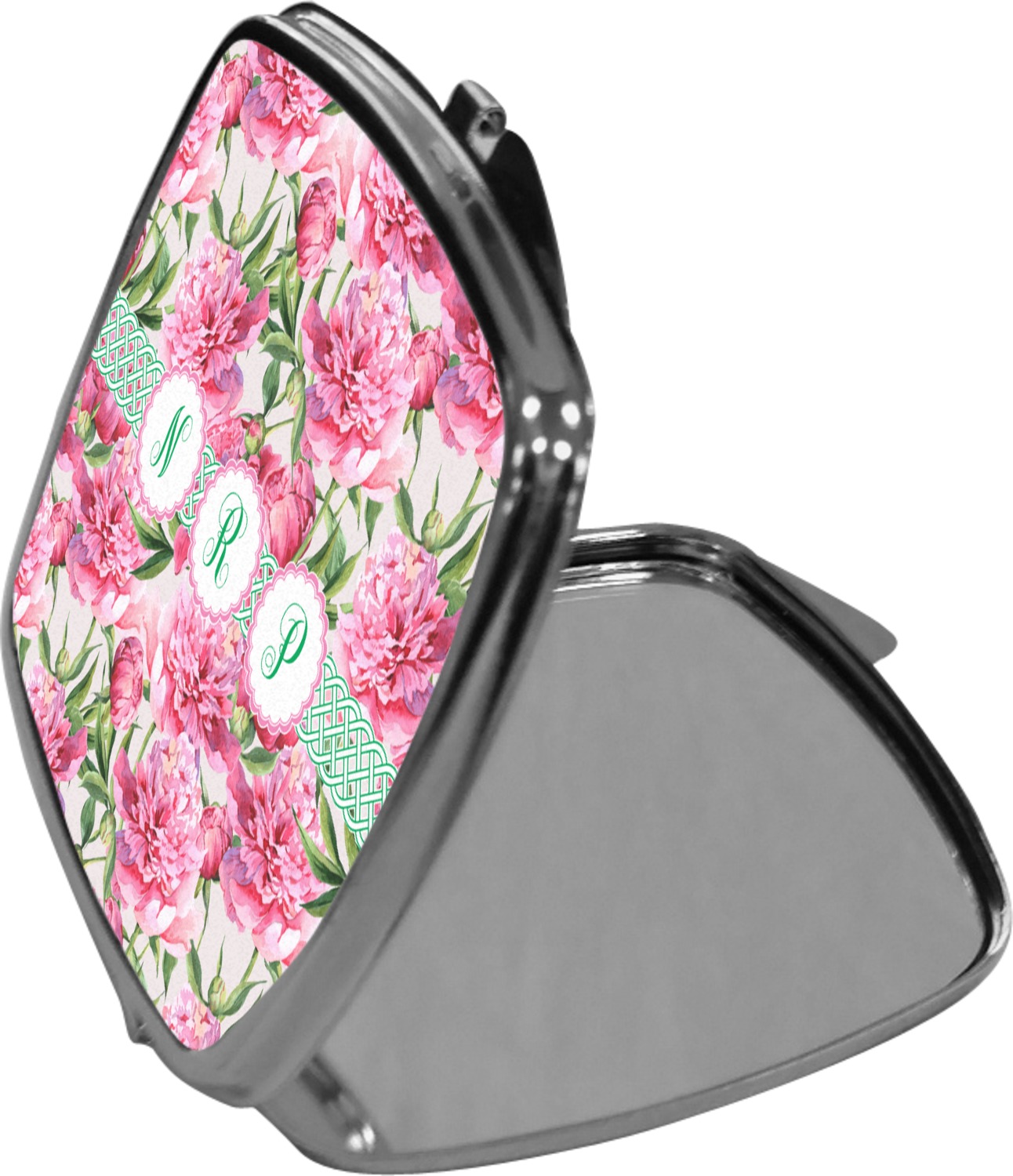 Our compact mirrors are customized with your design on one side. The other side is patterned silver tone metal. Inside, there are two mirrors.