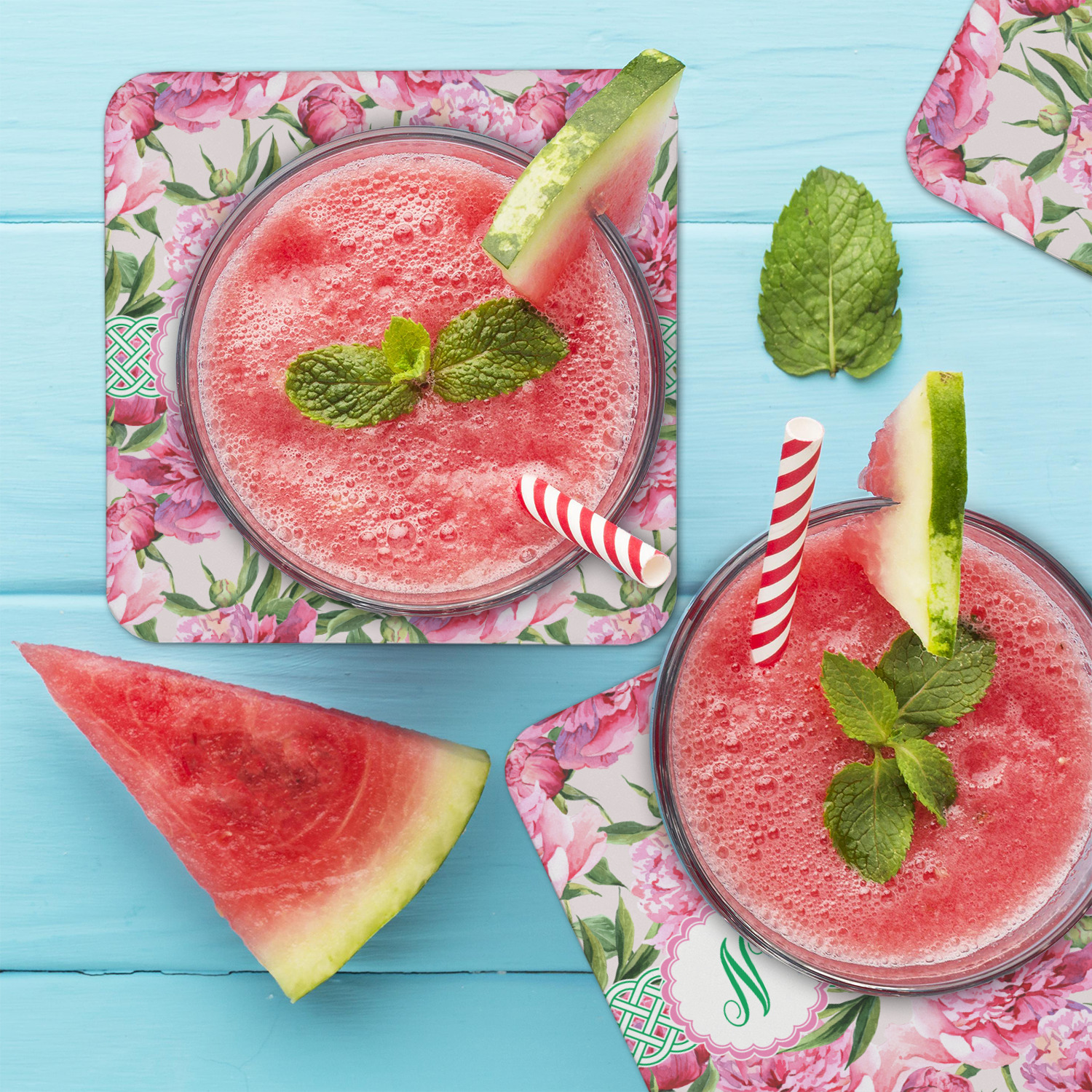 Your custom coasters have a smooth, laminated top and a cork bottom to prevent any unwanted slippage. We print your customized design atop this laminated surface, in bright and vibrant colors.