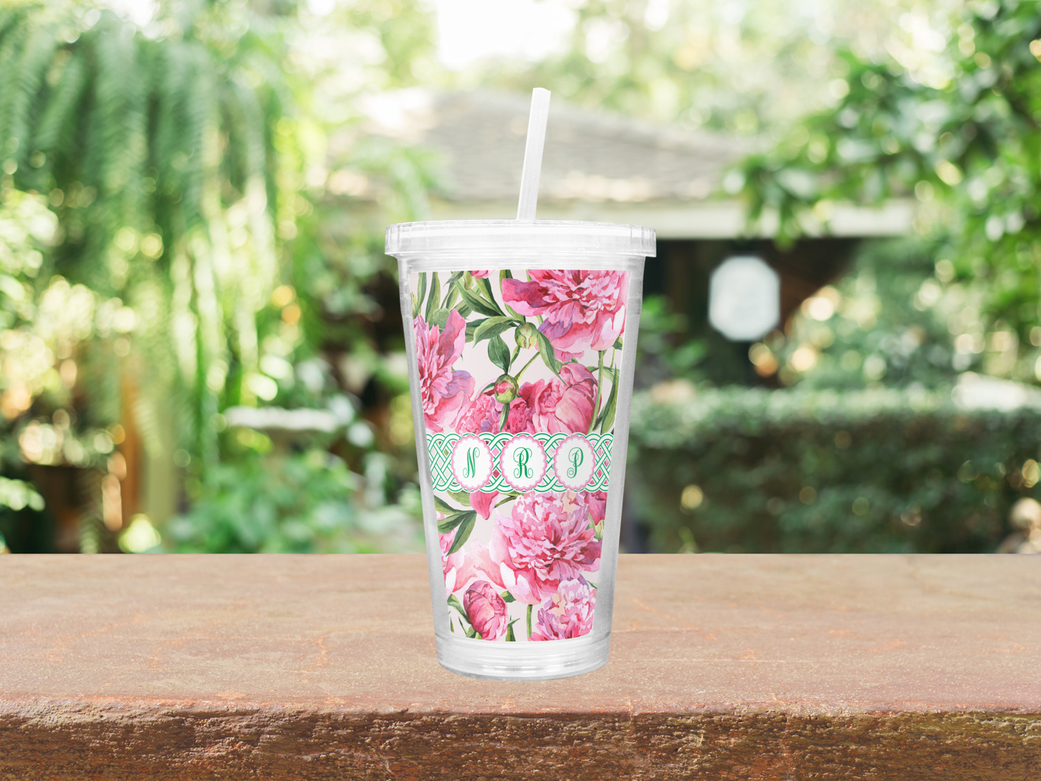 These BPA free tumblers with their double walls keep your drink cold and will not sweat on the outside; they have a clear acrylic top and a reusable straw with a ring around the bottom to keep the straw from falling out.