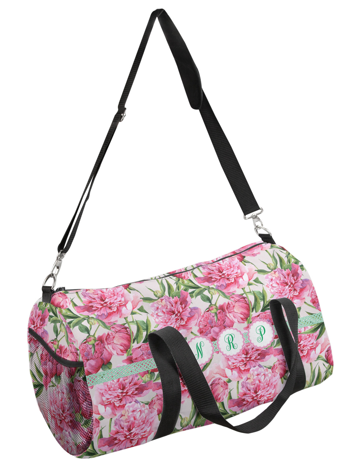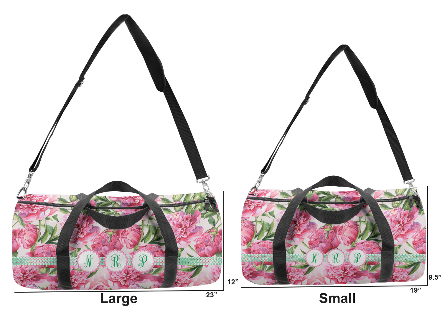 This duffle is a sturdy bag made of a canvas material. It comes in two sizes: Small (19"W x 9.5"H x 9.5"D) and Large (23"W x 12"H x 12"D). The bag is a cylindrical shape with a black adjustable strap and two handles. On one side is an elastic pouch to put a waterbottle or other small item. Your product will be sublimated with your design and is able to be designed on the front, back, and sides. Be sure to remember that the straps may cut into parts of your design if you upload your own artwork.