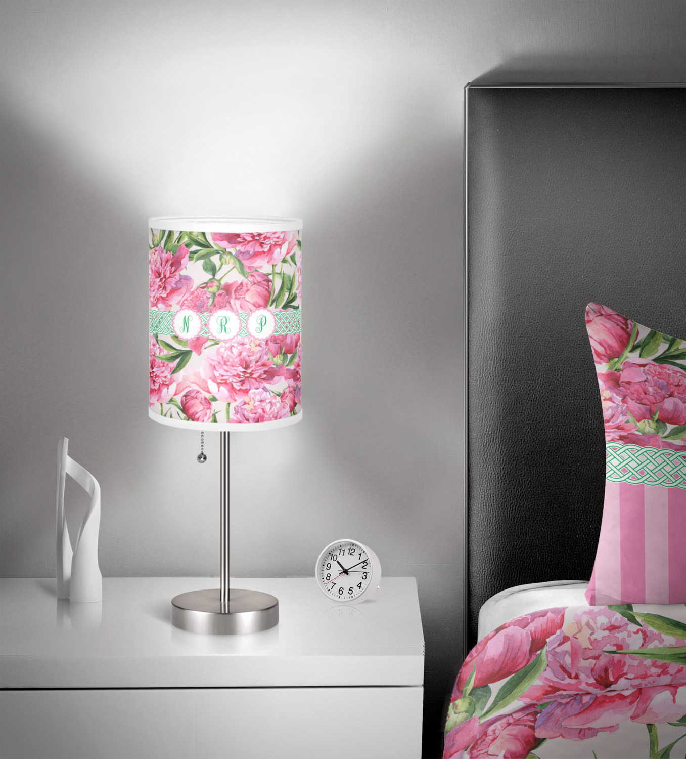 We chose to personalize it with Celtic ribbon and triple scallop labels with initials in each one of the labels. The coordinating design is also stunning with stripes of pink on the bottom.