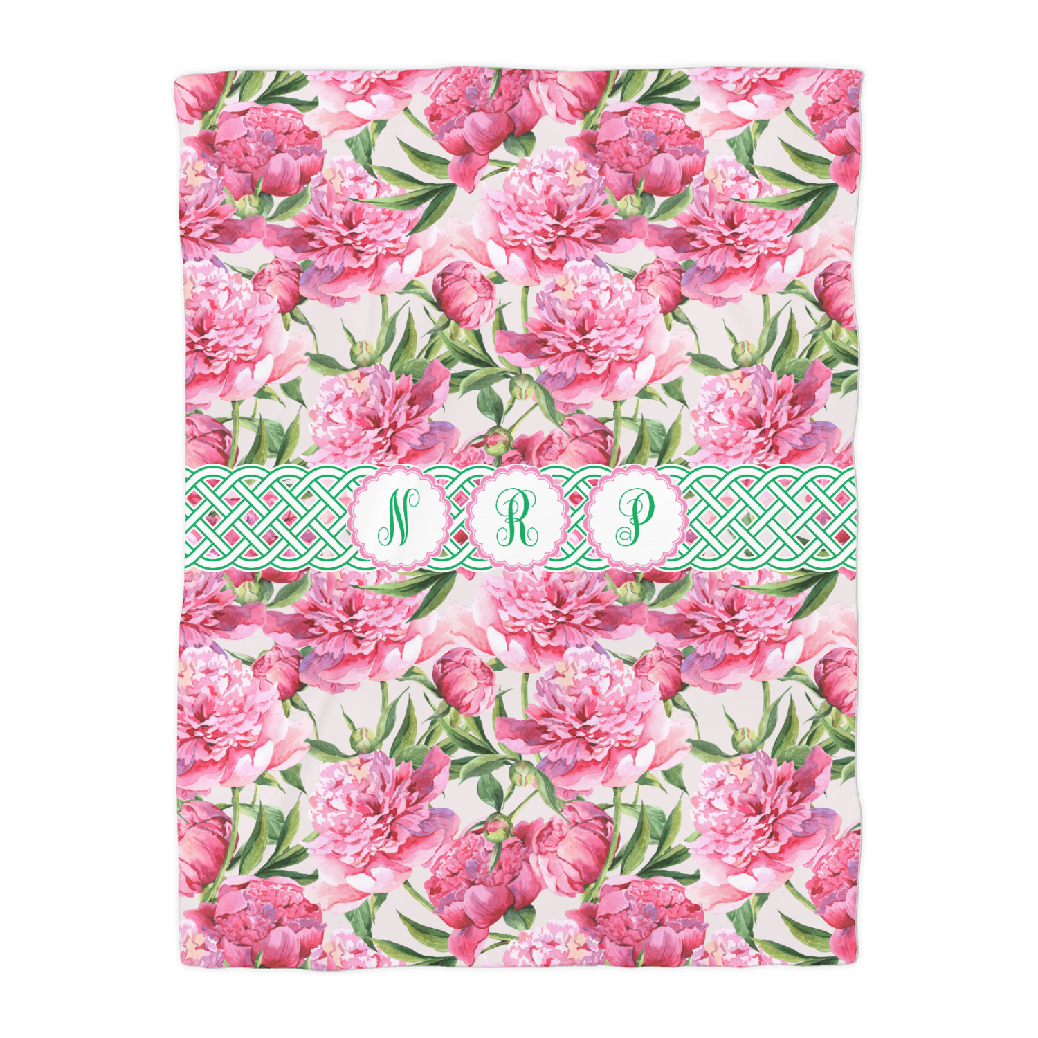 We chose to personalize it with Celtic ribbon and triple scallop labels with initials in each one of the labels. The coordinating design is also stunning with stripes of pink on the bottom.
