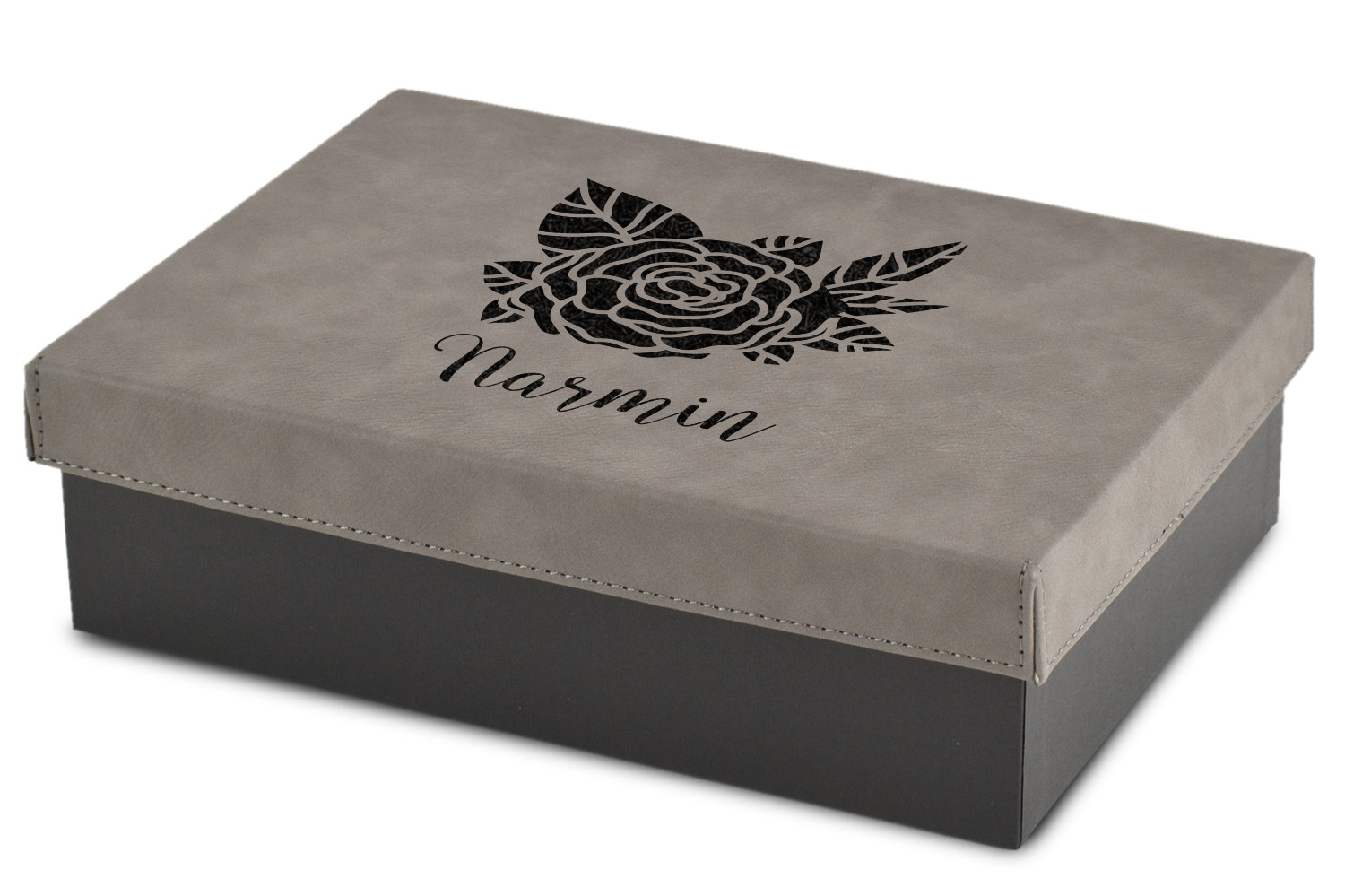 These gift boxes are available in 3 different sizes to accommodate various sized gifts. Available in gray as a neutral color for any occasion as well as to showcase your design boldly. Engraved with a laser this high quality paper board and faux leather gift box is unique and makes any gift stand out.