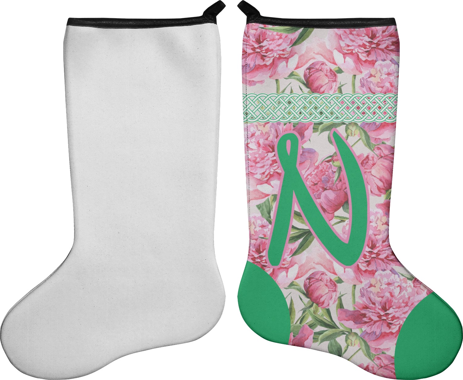 These 17" x 11" stockings are made of neoprene and have a black trim to give them a fantastic finished look. Your very own design is printed right onto the stocking, either single sided with white on the back or double sided where can use the same or different designs / patterns on the front and the back - the choice is yours. At the top of the stocking is a 2" loop for hanging.