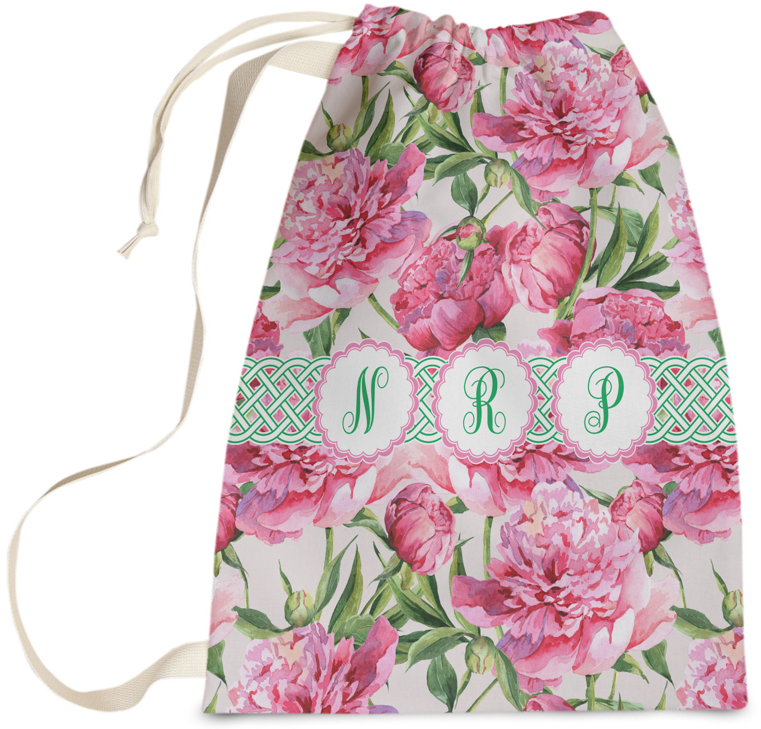 Carry your laundry in style with these customized laundry bags. Available in two sizes, featuring a natural colored woven strap and a cinch cord, these bags hold a lot of clothes or anything else you want to fit in them.