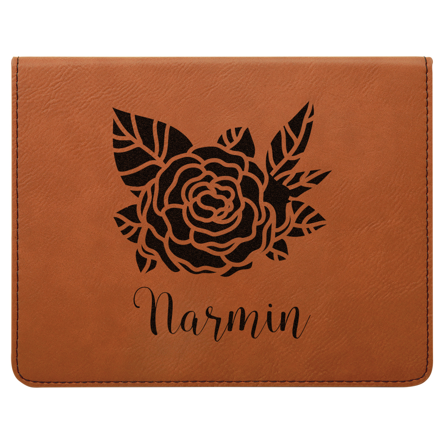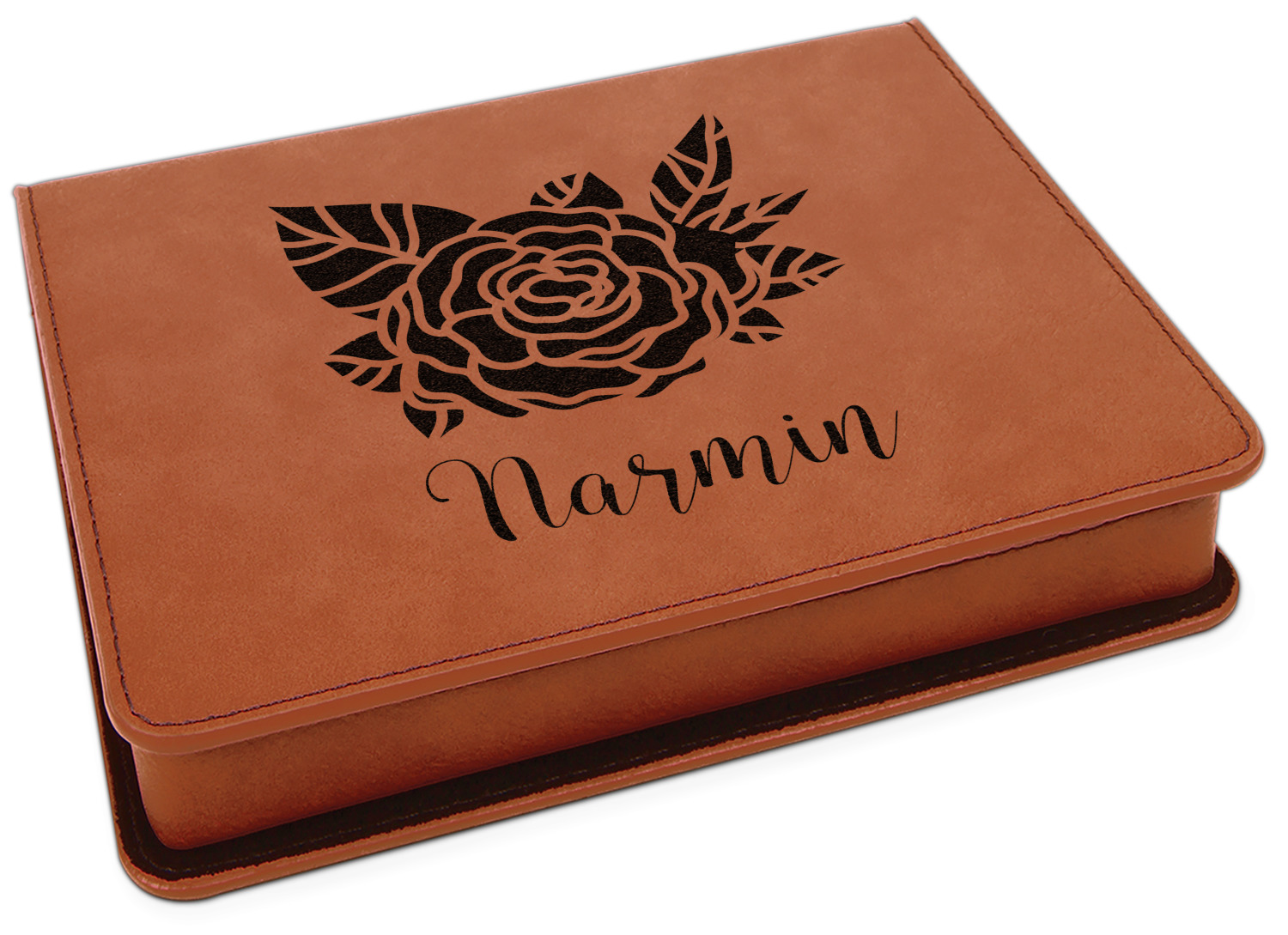 This set includes a wine stopper, pourer, drip ring, and a corkscrew! The exterior of the box is a gorgeous, cognac-brown leatherette, while the interior is covered in a black, velvety material. Four foam indentations, unique to the shape of the wine tool, are found at the bottom half of the box's interior. The tools fit snugly into each of their designated spots, and the foam material helps to protect the integrity of your tools. Each of the wine gadgets features a bamboo accent, with the location and style depending on the tool itself. We laser engrave your personalized design onto the lid of the box, which easily flips open and is secured closed by a small magnet. The wine accessories box measures at 7 by 5.5 inches in total.
