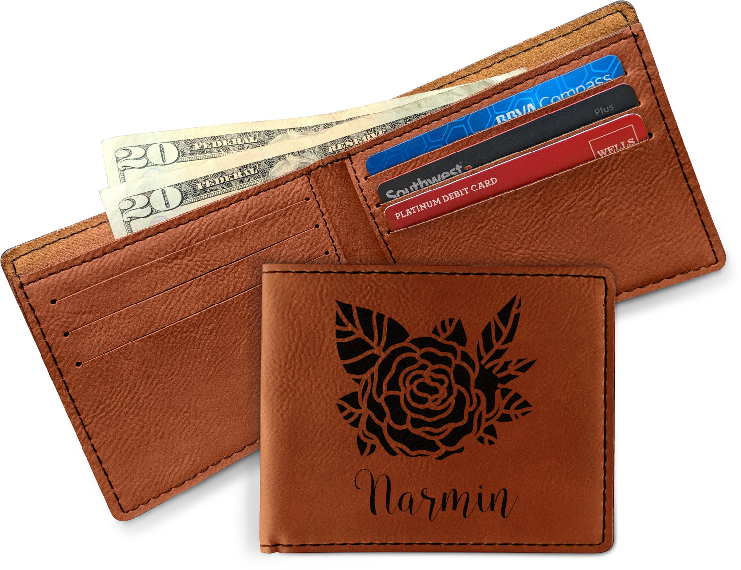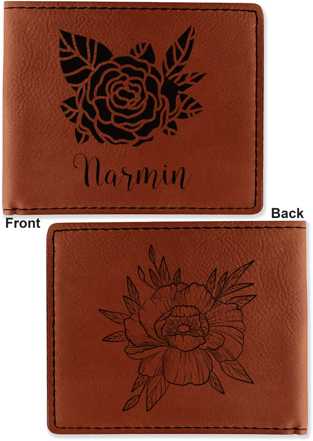 Your bifold wallet will be personalized by laser engraving, which will be a black color on the wallet. Choose a graphic, text, or monogram to personalize your wallet. There are thousands of choices in our design center.