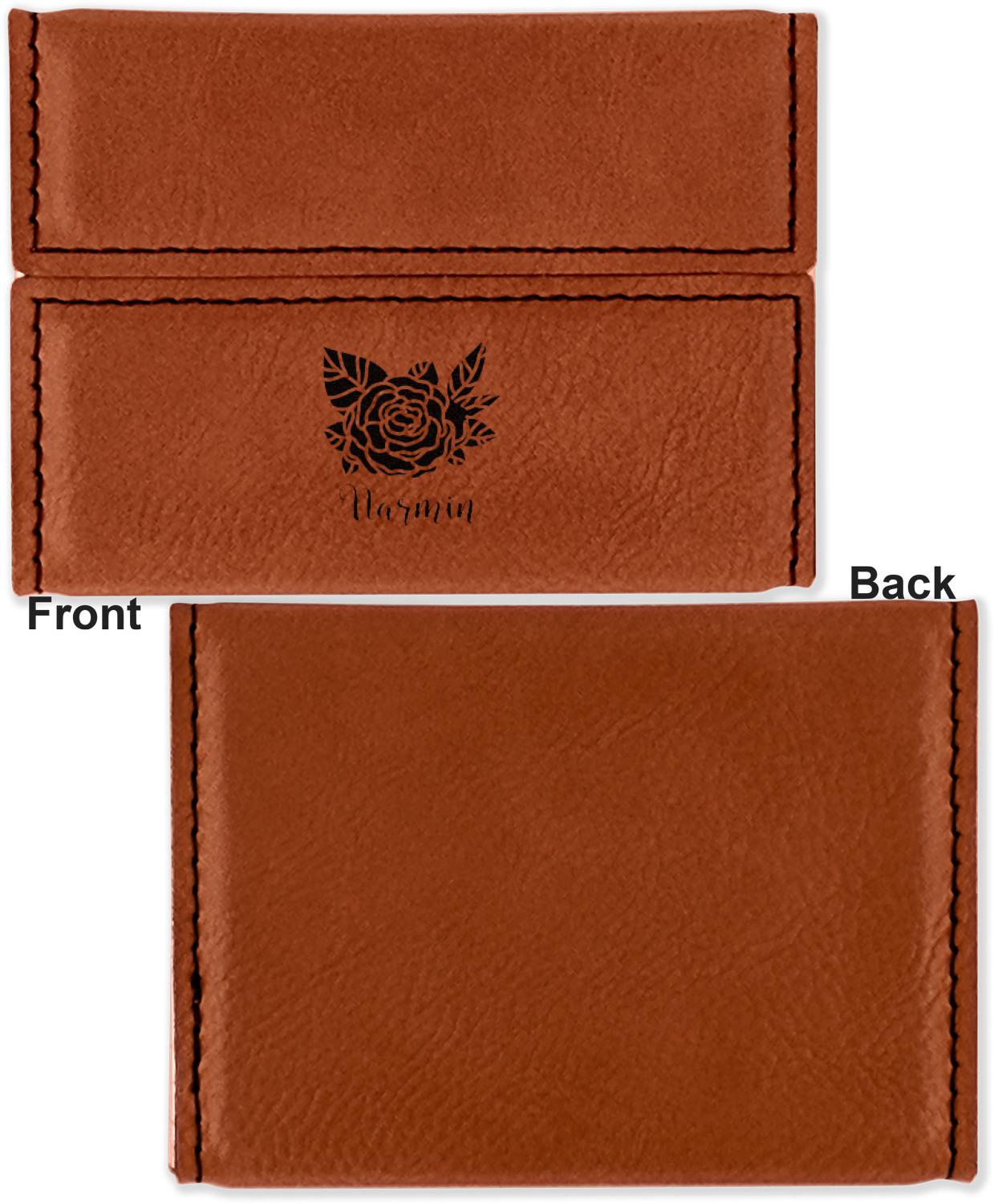 Your personalized design is laser engraved onto either the front, or the front and back of the card holder, depending on the model you purchase. Once engraved, the design will appear a darkened black against the cognac color of the leatherette.