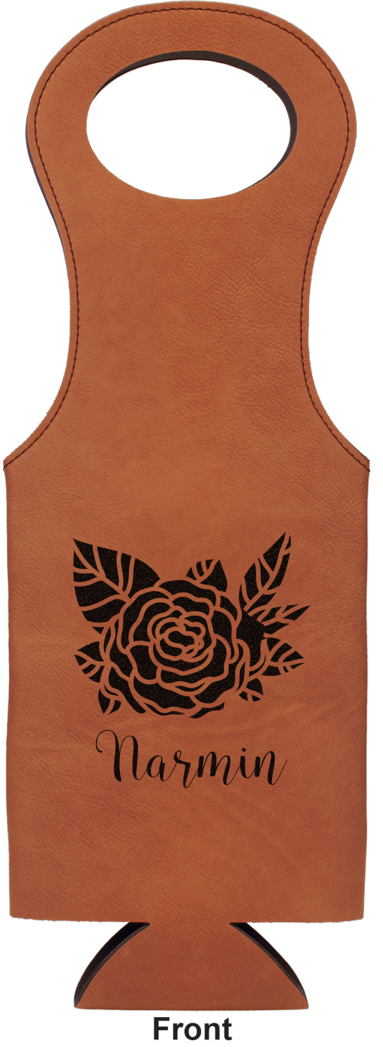 This wine carrier is made from a stunning leatherette, in a cognac-brown color. Strong, black stitching lines the sides of your wine bottle bag and provides extra durability. The interior is lined with a padded, black material to allow for a snug fit once your bottle is placed inside. At the top of this wine gift bag, you'll find two oval shaped handles that elegantly complements the rest of the bag's style. We provide you with the option of laser-engraving the front, or the front and back of your new personalized wine bag!