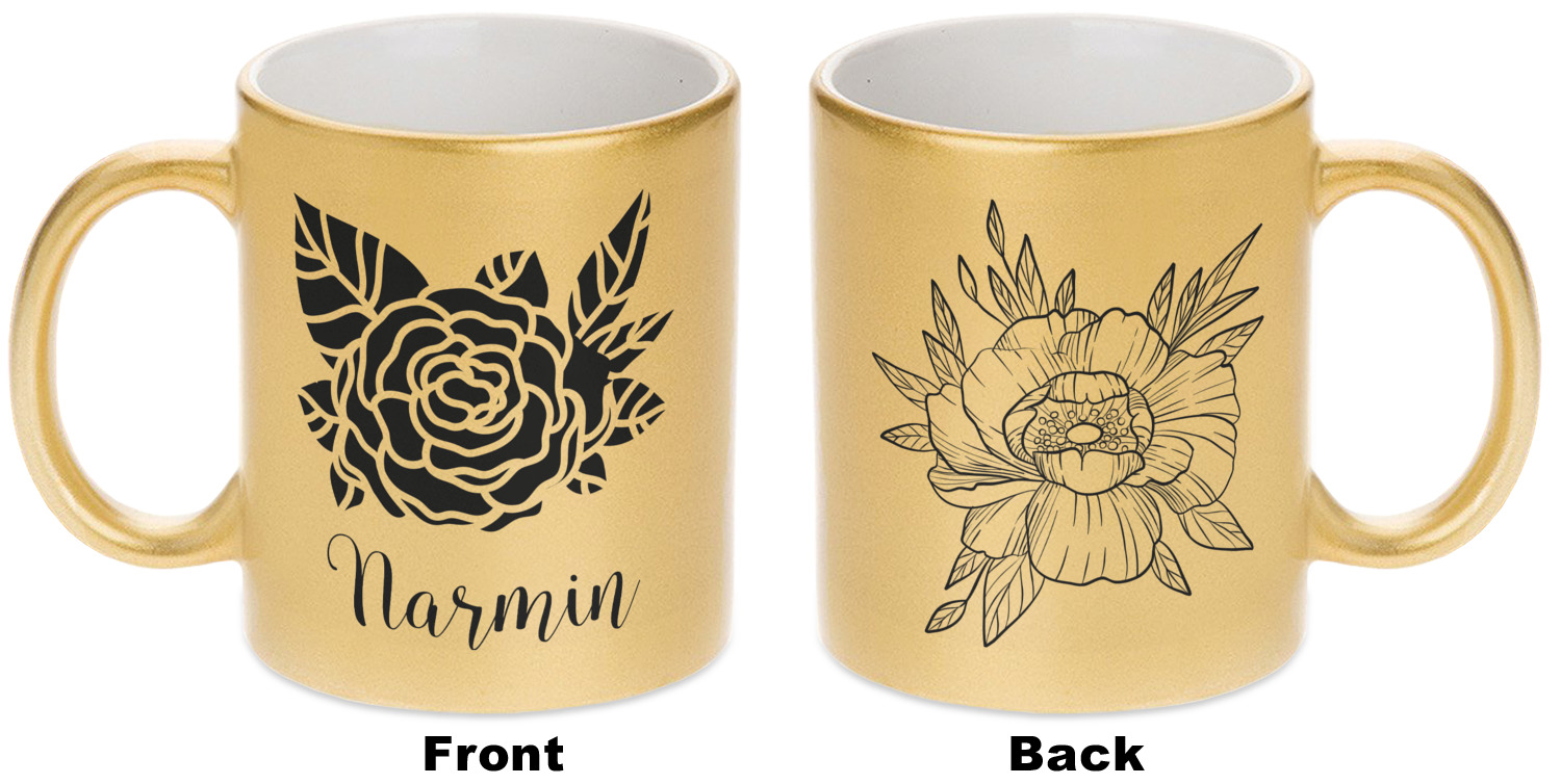 Our custom mugs are ceramic, which is great for keeping your tea or coffee warm! We offer two metallic mugs to personalize - Silver or Gold. Both styles hold around 11oz and have dimensions of approximately 3.75" x 3.5" x 4.75". Both the metallic mugs come in a matte finish and have glitter detailing to add a more pristine feel to the gold and silver base colors.