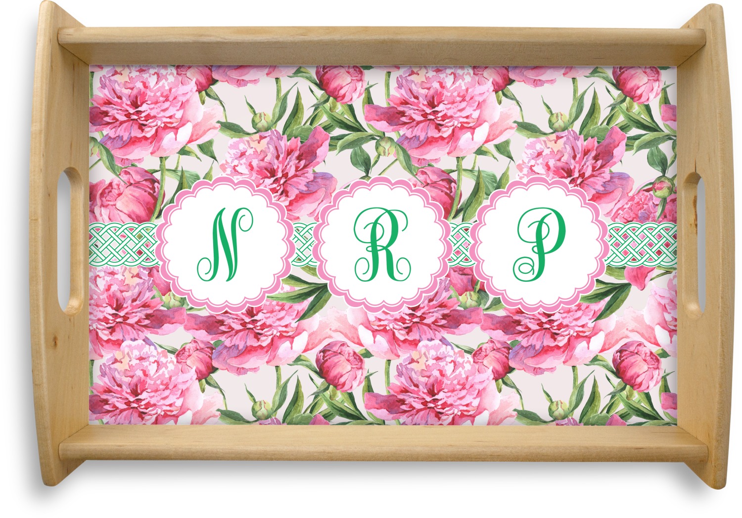 This serving tray with handles features square edges and two rounded sides, creating a very modern look. Each side is fabricated from a beautifully cut, natural wood. The bottom of the interior of the tray displays your customized design in bright, vibrant color. The tray is sold in both a black color and a natural wood look. Each variation of the wood serving tray has two sizes: Small, which is 14" x 10" x 2.25", and Large, which is 19.5" x 13.5" x 2.75".