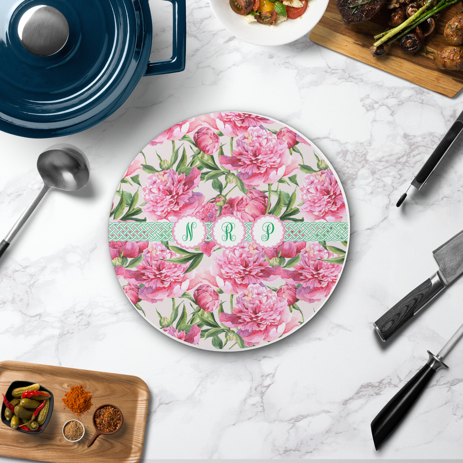 The round trivets can be customized with your own design, your own photo, or your own logo. You can add personalization, like a monogram, family name or initial to your uploaded design / art. You can also customize one of our designs and change the patterns, colors, personalization, fonts etc.