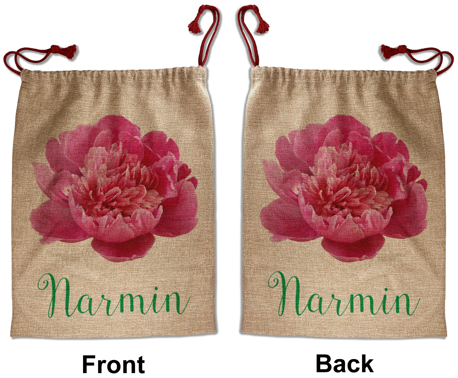 Our Santa sacks print your design on the burlap material giving it a nice rustic, natural design! The burlap material is also machine washable and wrinkle-free, so feel free to fold and store out Santa bags until the next time you need it! Secure your gifts with our red accent drawstring ties at the top of the sack so the mystery of your gift stays a surprise until Christmas day. We offer two types of printing- one side partial print or double-sided partial printing. Design and personalize your own Santa sack in time for the holidays!