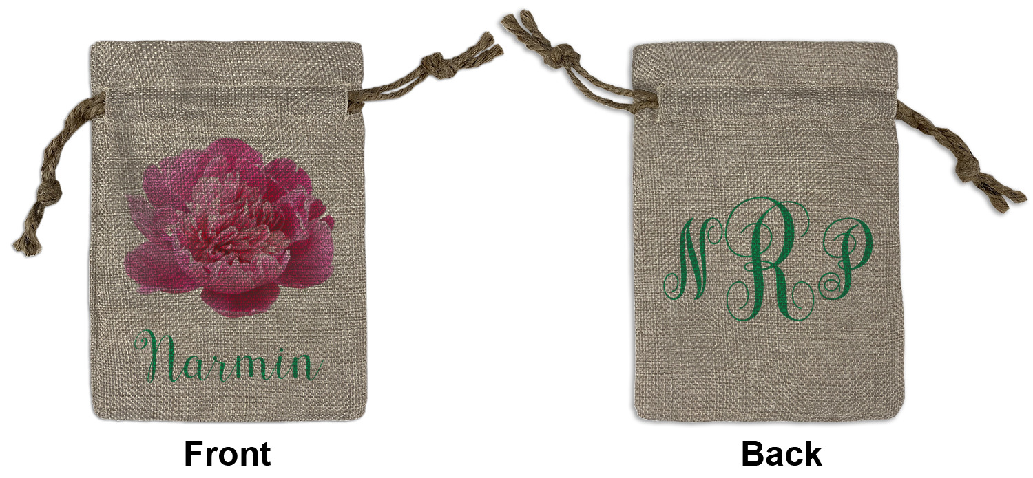 We sell our Burlap Gift Bags in 3 variant sized bags. Made with burlap polyester, each personalized bag can be secured with a twine drawstring pull. Your custom design is available to print on one side or both sides - completely up to you! The sizes of the bags measure approximately 4.5" x 6.5" for the smallest size, 6.5" x 8.0" for the medium size, and 6.5" x 13.5" for the large-sized bag.