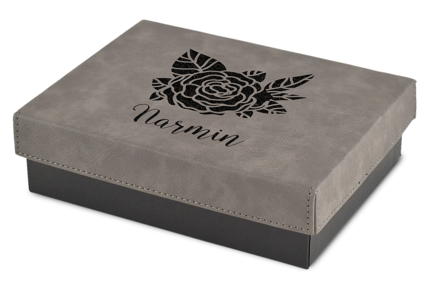 These gift boxes are available in 3 different sizes to accommodate various sized gifts. Available in gray as a neutral color for any occasion as well as to showcase your design boldly. Engraved with a laser this high quality paper board and faux leather gift box is unique and makes any gift stand out.