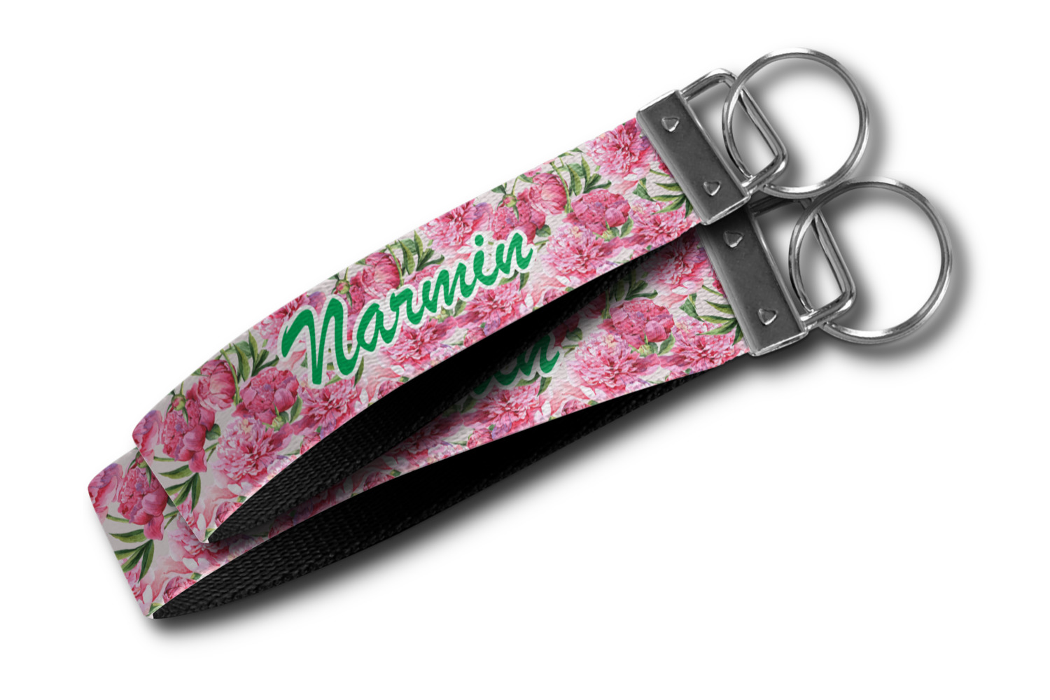 These key fob keychains are made from a polyester weave, right here in the USA. They feature a silver, metal clasp, attached to a round keyring. The piece gives the personalized wristlet a beautiful, finished look. Your customized design is printed on the outside of the keychain strap. We carry these wristlets in two sizes: small, which is 5 inches in width, and large, which is 5.5 inches in width.