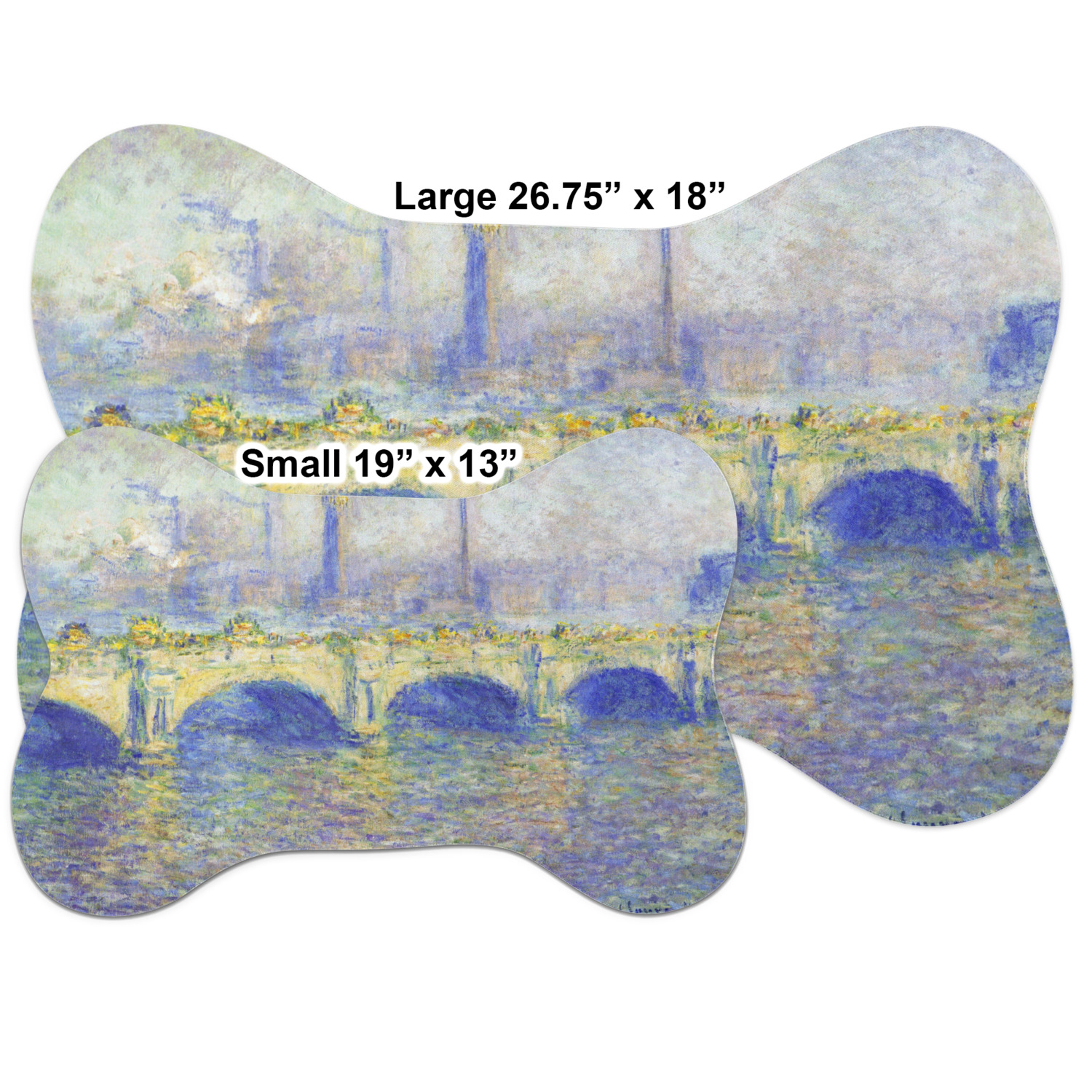 The top of this mat displays your custom design, as it is printed on polyester. To prevent slippage, the underside of the mat is made of rubber. We offer a small dog food mat, suitable for smaller dogs and a large dog food mat for bigger breeds. The small dog food mat is approximately 19 by 13 inches, while the large dog feeding mat measures at approximately 26.75 by 18 inches. Both personalized mats are ideally sized to fit two dog bowls.