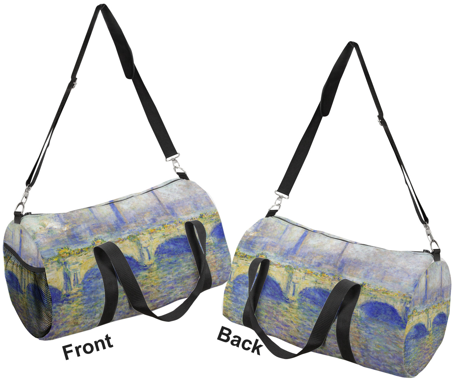 This duffle is a sturdy bag made of a canvas material. It comes in two sizes: Small (19"W x 9.5"H x 9.5"D) and Large (23"W x 12"H x 12"D). The bag is a cylindrical shape with a black adjustable strap and two handles. On one side is an elastic pouch to put a waterbottle or other small item. Your product will be sublimated with your design and is able to be designed on the front, back, and sides. Be sure to remember that the straps may cut into parts of your design if you upload your own artwork.