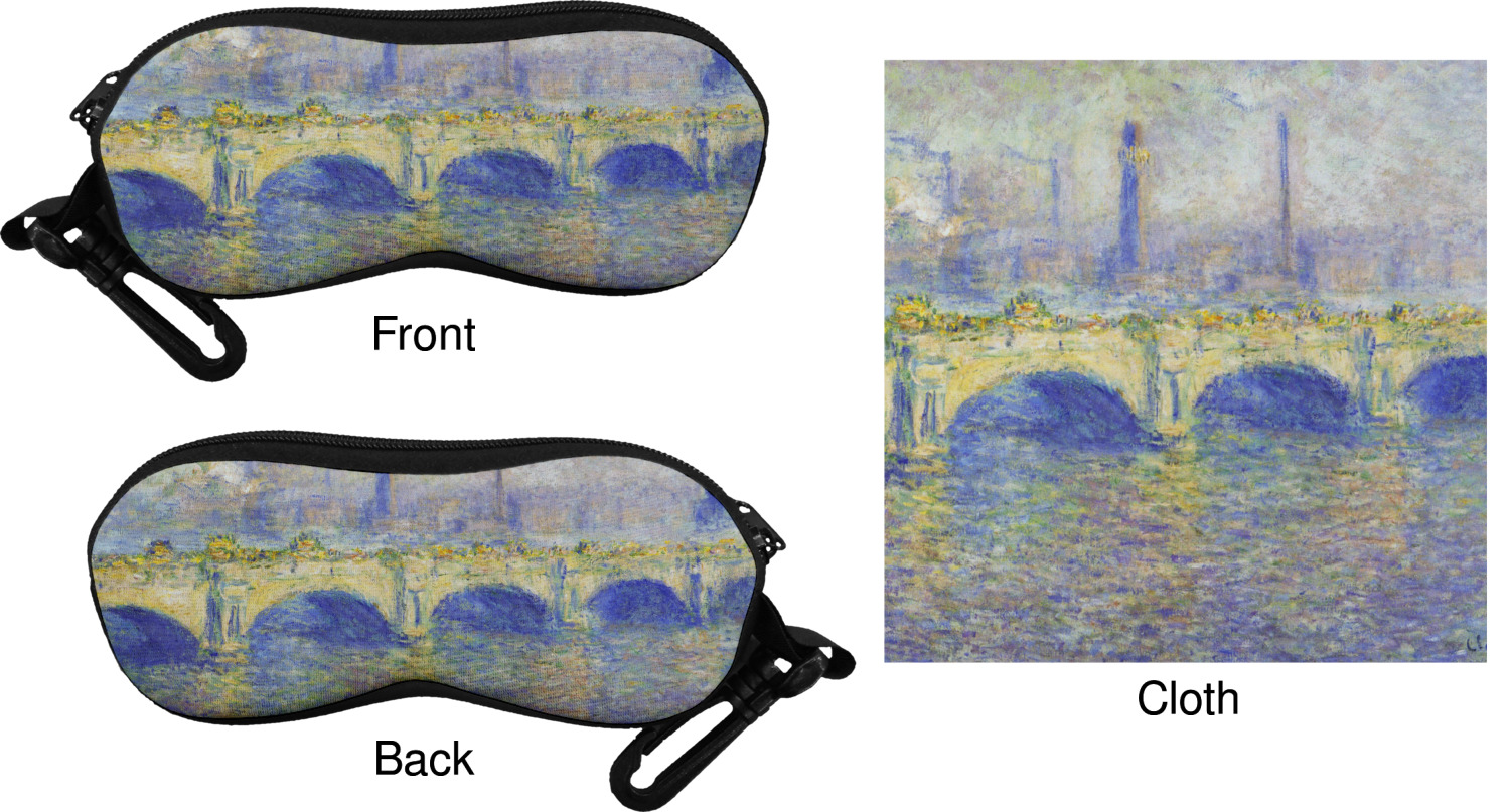 The cases have the design on both sides, a black zipper, and clips for hanging on a belt buckle or purse strap and also include matching lens cloths.