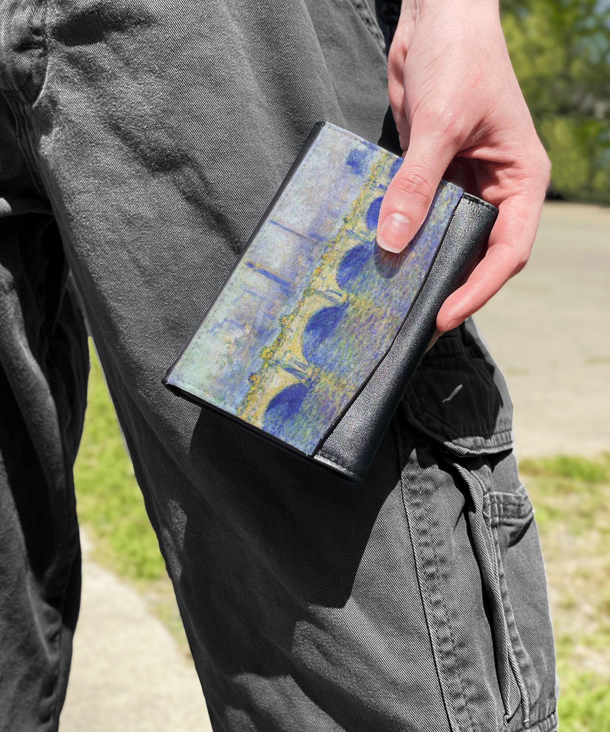 The compact size of this wallet - 5.5in wide, 3.5in tall and 0.75in thick when folded - makes it perfect to hold in hand and small enough to fit in a clutch or a normal size purse. The outside flap is customized with your choice of artwork and closes with a snap closure - with two different snaps to allow it to be adjusted when storing more items - to securely fasten the flap.