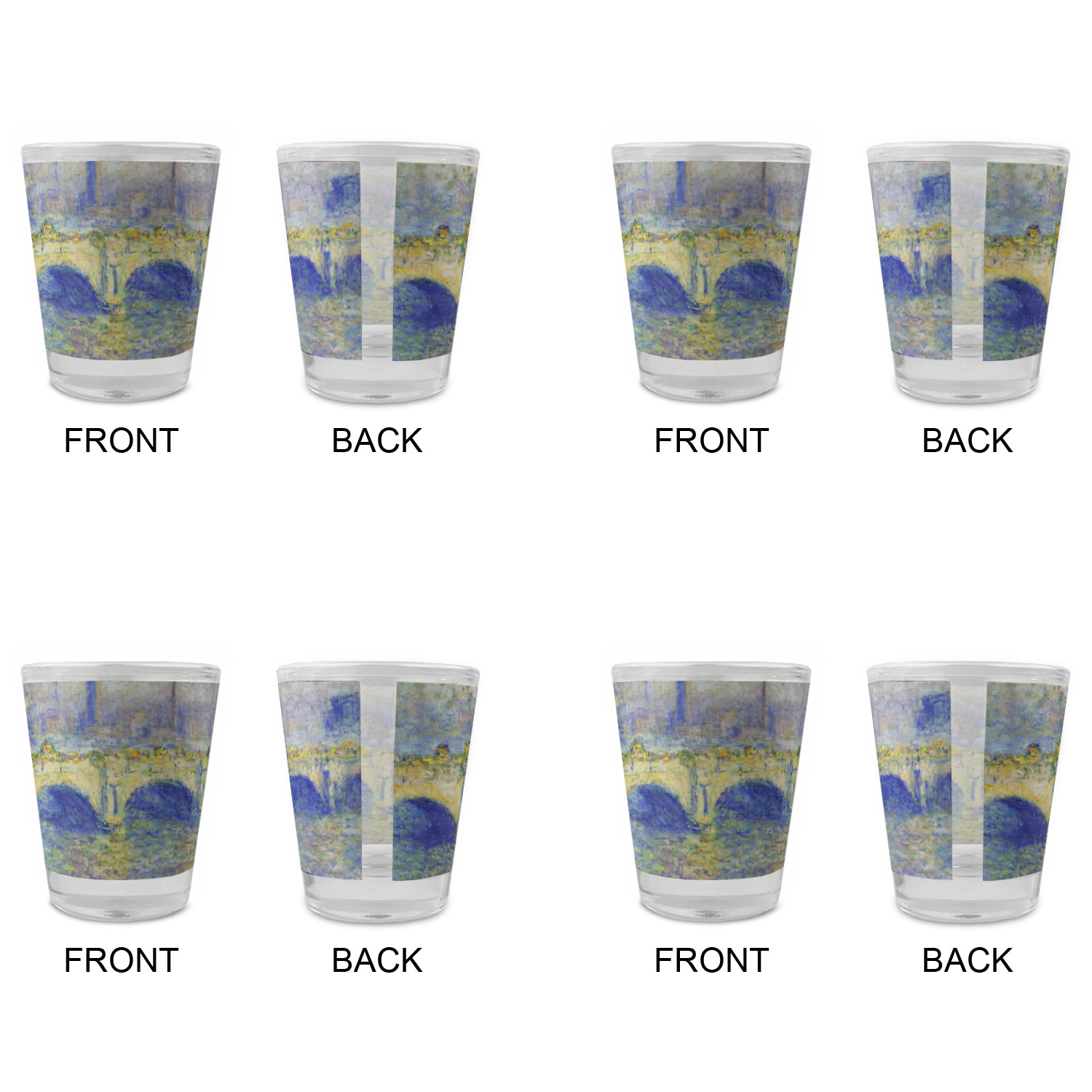 Made with frosted glass, these shot glasses are printed in full color with the design of your choice. They are a standard 1.5oz shot glass and are 2.4" tall. The print is wrapped around the shot glass in a full wrap and boldly displays your customization.