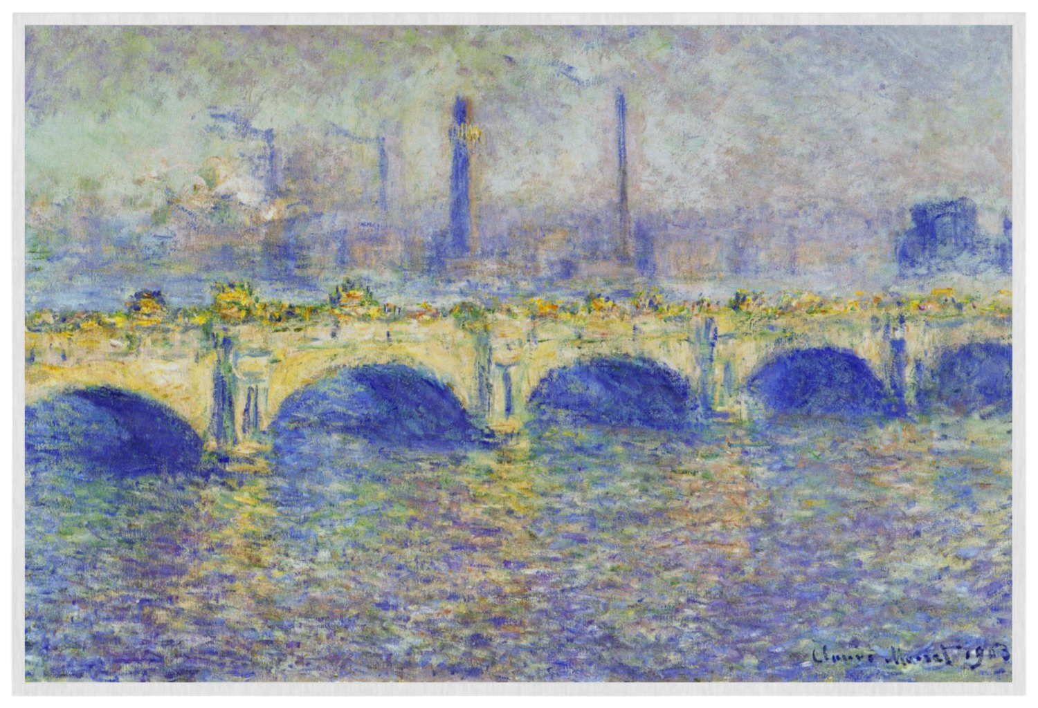Claude Monet spent some time painting the city of London, which he felt would be gorgeous if only there was not so much fog. Monet spent a period of his time there waking up in the mornings just to paint the Waterloo Bridge. This was one of several paintings of the bridge, displaying it on a rare sunny day.