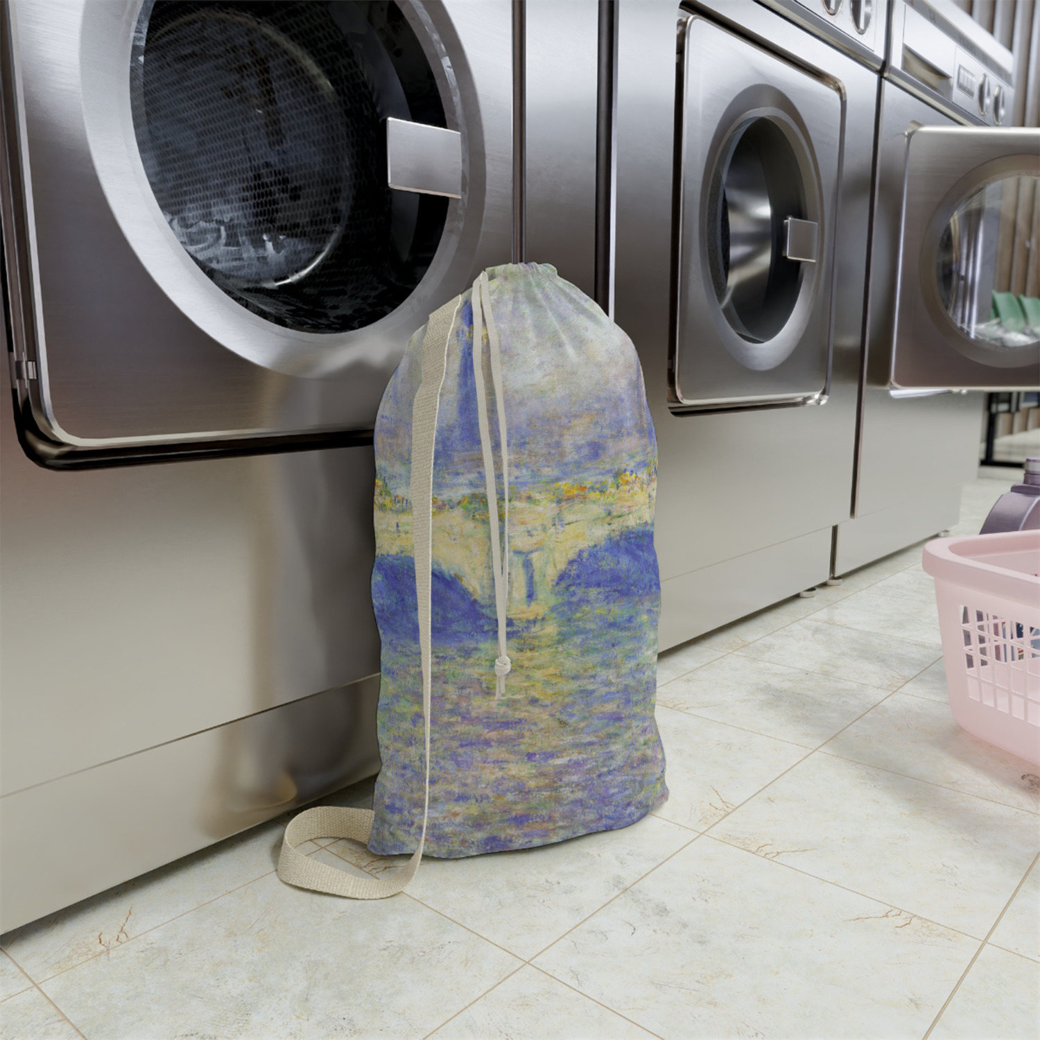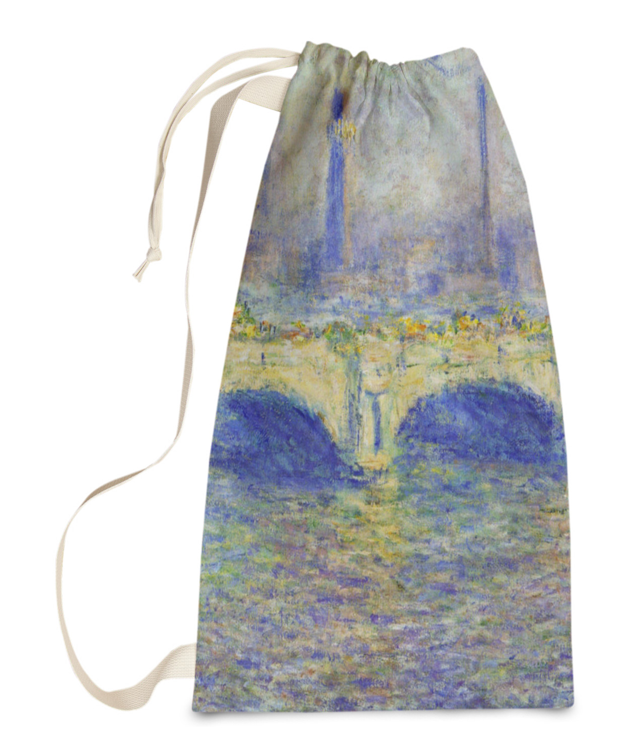 Carry your laundry in style with these customized laundry bags. Available in two sizes, featuring a natural colored woven strap and a cinch cord, these bags hold a lot of clothes or anything else you want to fit in them.
