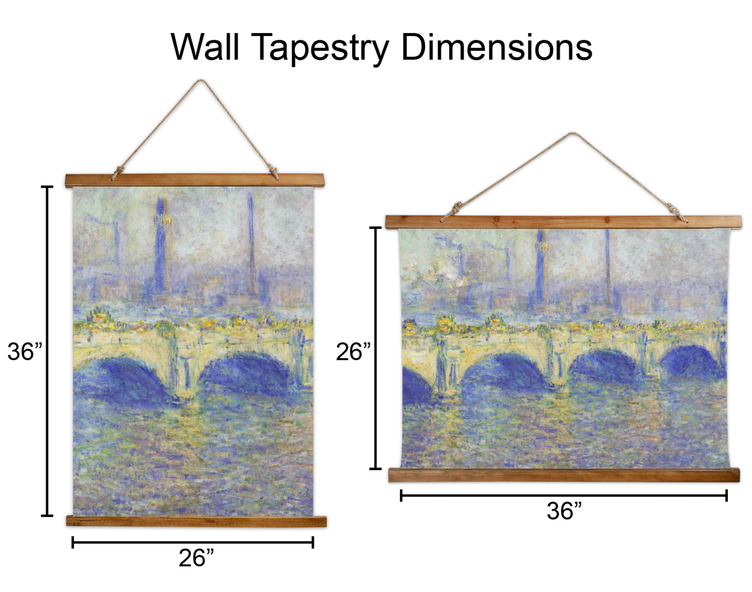 Made in two different orientations - portrait or landscape - both are 26" x 36". Your design is printed on a high quality polyester fabric with hemmed edges. The wood on the top and bottom of the tapestry is 1.25" tall and 0.25" thick and there are two pieces on top and bottom which sandwich the fabric.
