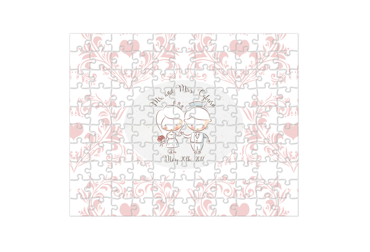 This design has an adorable bride and groom at the center of attention. They sit holding hands on a speckle textured off-white background. Above and below them is where the personalization goes, with the bride and groom's names and wedding date or whatever you choose. The textured background is a circle that surrounds the bride and groom while another background sits behind this circle. The secondary background is a white and light pink heart damask pattern, which looks adorable with the couples and their sweet rosy cheeks.